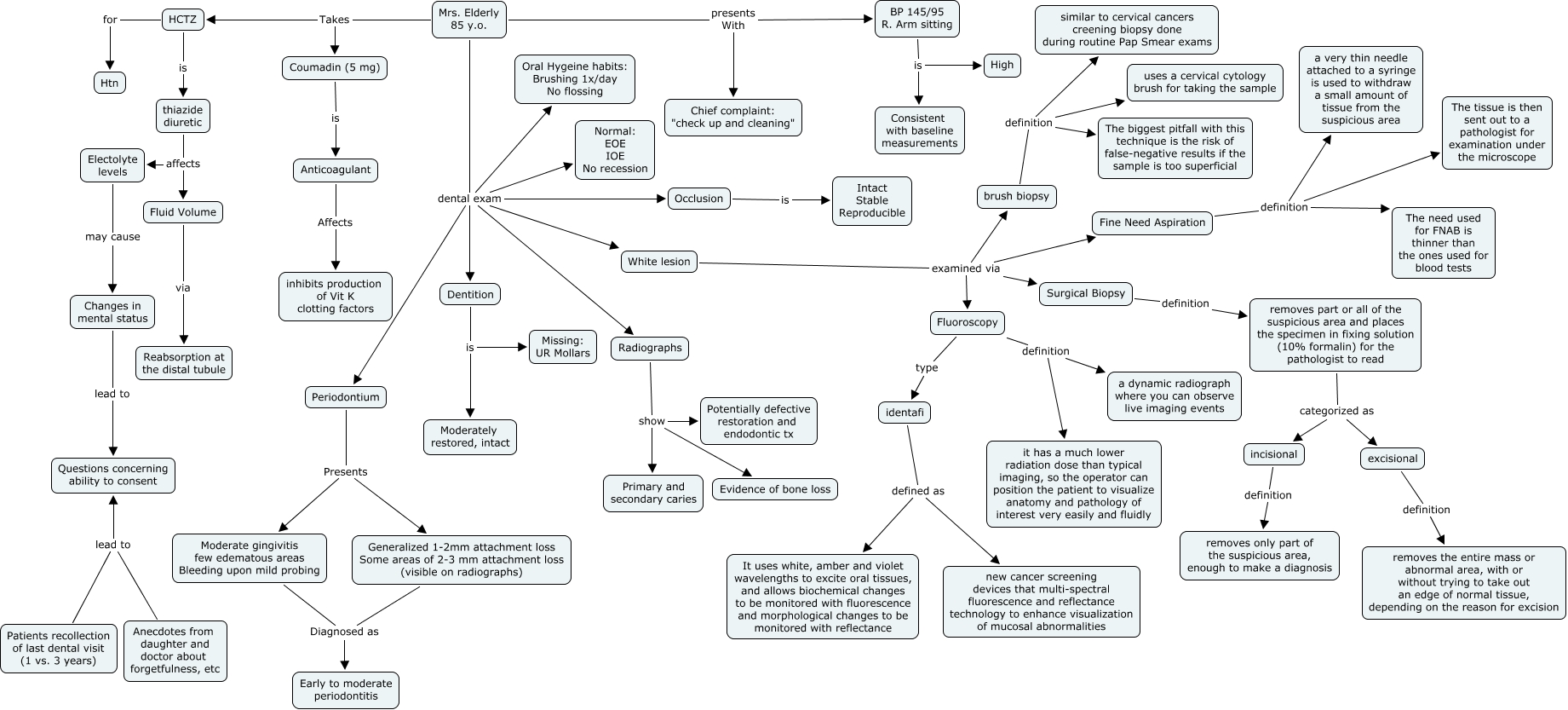 This Concept Map, created with IHMC CmapTools, has information related to: mrs. Elderly, Mrs. Elderly 85 y.o. dental exam White lesion, White lesion examined via Fluoroscopy, Coumadin (5 mg) is Anticoagulant, brush biopsy definition uses a cervical cytology brush for taking the sample, Mrs. Elderly 85 y.o. dental exam Oral Hygeine habits: Brushing 1x/day No flossing, Mrs. Elderly 85 y.o. dental exam Dentition, identafi defined as It uses white, amber and violet wavelengths to excite oral tissues, and allows biochemical changes to be monitored with fluorescence and morphological changes to be monitored with reflectance, Patients recollection of last dental visit (1 vs. 3 years) lead to Questions concerning ability to consent, Anecdotes from daughter and doctor about forgetfulness, etc lead to Questions concerning ability to consent, White lesion examined via Fine Need Aspiration, Radiographs show Evidence of bone loss, Surgical Biopsy definition removes part or all of the suspicious area and places the specimen in fixing solution (10% formalin) for the pathologist to read, Radiographs show Primary and secondary caries, Moderate gingivitis few edematous areas Bleeding upon mild probing Diagnosed as Early to moderate periodontitis, Periodontium Presents Generalized 1-2mm attachment loss Some areas of 2-3 mm attachment loss (visible on radiographs), Fine Need Aspiration definition The need used for FNAB is thinner than the ones used for blood tests, removes part or all of the suspicious area and places the specimen in fixing solution (10% formalin) for the pathologist to read categorized as excisional, Mrs. Elderly 85 y.o. Takes HCTZ, Mrs. Elderly 85 y.o. presents With BP 145/95 R. Arm sitting, brush biopsy definition The biggest pitfall with this technique is the risk of false-negative results if the sample is too superficial