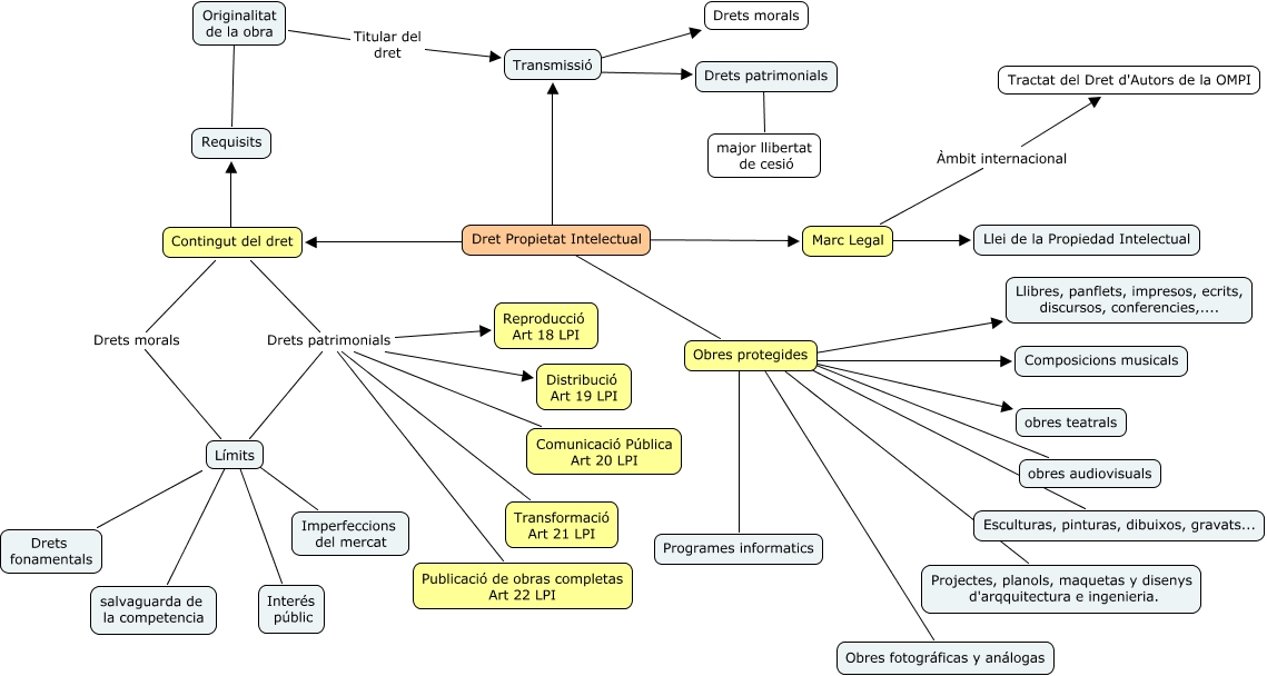 Este Cmap, tiene información relacionada con: Dret Propietat Intelectual.cmap, Transmissió ???? Drets morals, Límits ???? Drets fonamentals, Obres protegides ???? Programes informatics, Contingut del dret Drets patrimonials Reproducció Art 18 LPI, Contingut del dret Drets morals Límits, Obres protegides ???? obres teatrals, Obres protegides ???? Obres fotográficas y análogas, Contingut del dret Drets patrimonials Distribució Art 19 LPI, Obres protegides ???? Projectes, planols, maquetas y disenys d'arqquitectura e ingenieria., Contingut del dret Drets patrimonials Límits, Límits ???? Interés públic, Originalitat de la obra Titular del dret Transmissió, Marc Legal Àmbit internacional Tractat del Dret d'Autors de la OMPI, Drets patrimonials ???? major llibertat de cesió, Límits ???? Imperfeccions del mercat, Límits ???? salvaguarda de la competencia, Contingut del dret Drets patrimonials Publicació de obras completas Art 22 LPI, Contingut del dret Drets patrimonials Transformació Art 21 LPI, Contingut del dret Drets patrimonials Comunicació Pública Art 20 LPI, Marc Legal ???? Llei de la Propiedad Intelectual