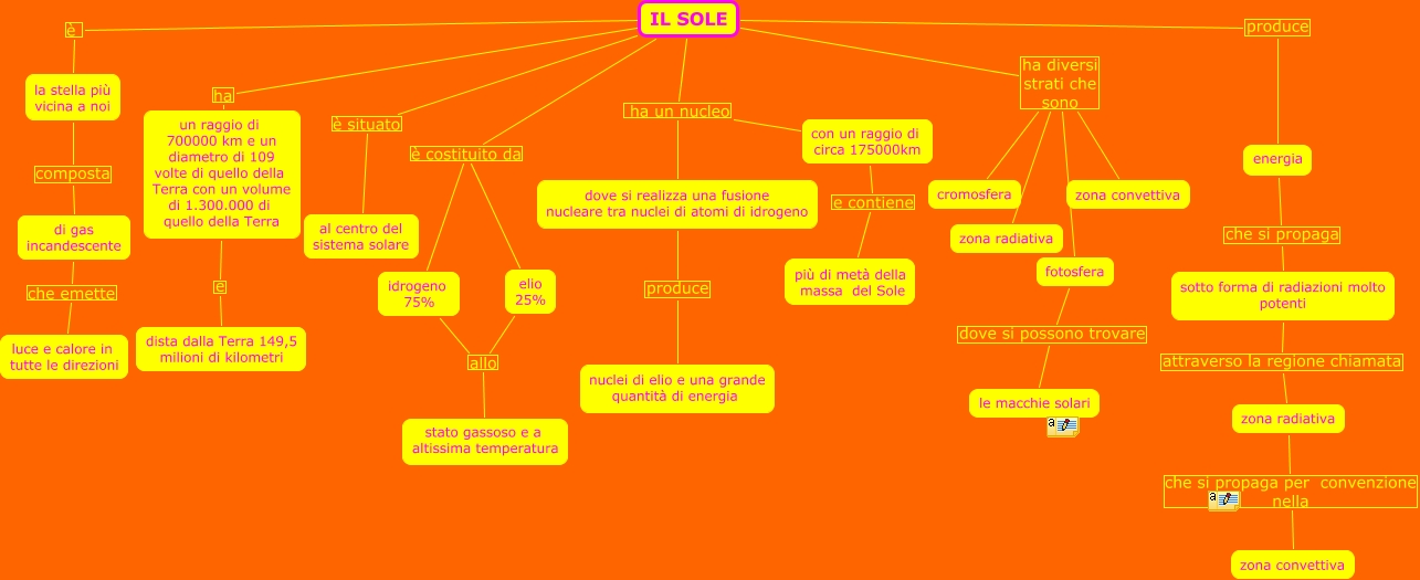 Questa Cmap, creata con IHMC CmapTools, contiene informazioni relative a: sole, elio 25% allo stato gassoso e a altissima temperatura, energia che si propaga sotto forma di radiazioni molto potenti, IL SOLE ha diversi strati che sono cromosfera, con un raggio di circa 175000km e contiene più di metà della massa del Sole, IL SOLE ha un nucleo dove si realizza una fusione nucleare tra nuclei di atomi di idrogeno, IL SOLE ha diversi strati che sono zona convettiva, zona radiativa che si propaga per convenzione nella zona convettiva, la stella più vicina a noi composta di gas incandescente, IL SOLE ha diversi strati che sono zona radiativa, dove si realizza una fusione nucleare tra nuclei di atomi di idrogeno produce nuclei di elio e una grande quantità di energia, IL SOLE è la stella più vicina a noi, idrogeno 75% allo stato gassoso e a altissima temperatura, IL SOLE è situato al centro del sistema solare, sotto forma di radiazioni molto potenti attraverso la regione chiamata zona radiativa, un raggio di 700000 km e un diametro di 109 volte di quello della Terra con un volume di 1.300.000 di quello della Terra e dista dalla Terra 149,5 milioni di kilometri, IL SOLE produce energia, fotosfera dove si possono trovare le macchie solari, di gas incandescente che emette luce e calore in tutte le direzioni, IL SOLE ha diversi strati che sono fotosfera, IL SOLE è costituito da idrogeno 75%