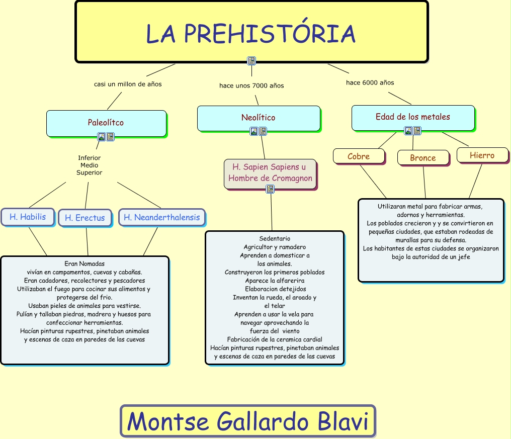 Este Cmap, tiene información relacionada con: la prehistoria, Neolítico ???? H. Sapien Sapiens u Hombre de Cromagnon, Utilizaran metal para fabricar armas, adornos y herramientas. Los poblados crecieron y y se convirtieron en pequeñas ciudades, que estaban rodeadas de murallas para su defensa. Los habitantes de estas ciudades se organizaron bajo la autoridad de un jefe ???? Hierro, LA PREHISTÓRIA hace unos 7000 años Neolítico, LA PREHISTÓRIA hace 6000 años Edad de los metales, LA PREHISTÓRIA casi un millon de años Paleolítco, Paleolítco Inferior Medio Superior H. Neanderthalensis, Paleolítco Inferior Medio Superior H. Erectus, Edad de los metales ???? Hierro, Utilizaran metal para fabricar armas, adornos y herramientas. Los poblados crecieron y y se convirtieron en pequeñas ciudades, que estaban rodeadas de murallas para su defensa. Los habitantes de estas ciudades se organizaron bajo la autoridad de un jefe ???? Bronce, Paleolítco Inferior Medio Superior H. Habilis, H. Sapien Sapiens u Hombre de Cromagnon ???? Sedentario Agricultor y ramadero Aprenden a domesticar a los animales. Construyeron los primeros poblados Aparece la alfarerira Elaboracion detejidos Inventan la rueda, el aroado y el telar Aprenden a usar la vela para navegar aprovechando la fuerza del viento Fabricación de la ceramica cardial Hacían pinturas rupestres, pinetaban animales y escenas de caza en paredes de las cuevas, Edad de los metales ???? Bronce, Edad de los metales ???? Cobre, Utilizaran metal para fabricar armas, adornos y herramientas. Los poblados crecieron y y se convirtieron en pequeñas ciudades, que estaban rodeadas de murallas para su defensa. Los habitantes de estas ciudades se organizaron bajo la autoridad de un jefe ???? Cobre, Eran Nomadas vivían en campamentos, cuevas y cabañas. Eran cadadores, recolectores y pescadores Utilizaban el fuego para cocinar sus alimentos y protegerse del frio. Usaban pieles de animales para vestirse. Pulían y tallaban piedras, madrera y huesos para confeccionar herramientas. Hacían pinturas rupestres, pinetaban animales y escenas de caza en paredes de las cuevas ???? H. Neanderthalensis, Eran Nomadas vivían en campamentos, cuevas y cabañas. Eran cadadores, recolectores y pescadores Utilizaban el fuego para cocinar sus alimentos y protegerse del frio. Usaban pieles de animales para vestirse. Pulían y tallaban piedras, madrera y huesos para confeccionar herramientas. Hacían pinturas rupestres, pinetaban animales y escenas de caza en paredes de las cuevas ???? H. Erectus