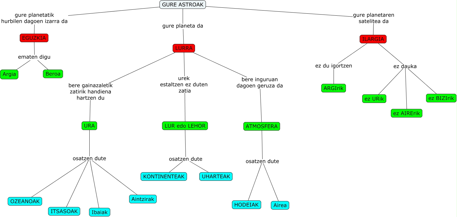 Este Cmap, tiene información relacionada con: Lurra 1, ILARGIA ez dauka ez BIZIrik, URA osatzen dute OZEANOAK, GURE ASTROAK gure planetatik hurbilen dagoen izarra da EGUZKIA, LURRA bere inguruan dagoen geruza da ATMOSFERA, LURRA urek estaltzen ez duten zatia LUR edo LEHOR, URA osatzen dute Ibaiak, GURE ASTROAK gure planetaren satelitea da ILARGIA, ATMOSFERA osatzen dute Airea, EGUZKIA ematen digu Argia, URA osatzen dute ITSASOAK, LURRA bere gainazaletik zatirik handiena hartzen du URA, ATMOSFERA osatzen dute HODEIAK, ILARGIA ez dauka ez URik, LUR edo LEHOR osatzen dute UHARTEAK, EGUZKIA ematen digu Beroa, URA osatzen dute Aintzirak, ILARGIA ez du igortzen ARGIrik, ILARGIA ez dauka ez AIRErik, LUR edo LEHOR osatzen dute KONTINENTEAK, GURE ASTROAK gure planeta da LURRA