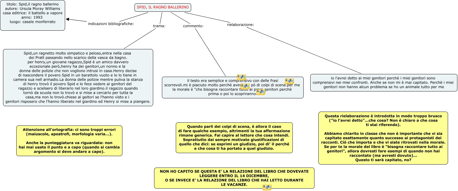 Questa Cmap, creata con IHMC CmapTools, contiene informazioni relative a: Relazione.Luca Fedi, SPID, IL RAGNO BALLERINO rielaborazione: io l'avrei detto ai miei genitori perchè i miei genitori sono comprensivi nei miei confronti. Anche se non mi è mai capitato. Perchè i miei genitori non hanno alcun problema se ho un animale tutto per me, SPID, IL RAGNO BALLERINO indicazioni bibliografiche: titolo: Spid,il ragno ballerino autore: Ursula Moray Williams casa editrice: il battello a vapore anno: 1993 luogo: casale monferrato, SPID, IL RAGNO BALLERINO trama: Spid,un ragnetto molto simpatico e peloso,entra nella casa dei Pratt passando nello scarico della vasca da bagno. per henry,un giovane ragazzo,Spid è un amico davvero eccezionale però,henry ha dei genitori,un nonno e la donna delle polizie che non vogliono intrusi in casa.Henry decise di nascondere il povero Spid in un barattolo vuoto e lo lo tiene in camera sua nell armadio.La donna delle polizie mentre puliva la stanza di henry trovò il povero Spid e lo fece vedere ai genitori del ragazzo e scielsero di liberarlo nel loro giardino.il ragazzo quando tornò da scuola non lo trovò e si mise a cercarlo per tutta la casa,ma non lo trovò.chiese ai geitori se l'hanno visto e i genitori risposero che l'hanno liberato nel giardino ed Henry si mise a piangere., SPID, IL RAGNO BALLERINO commento: il testo era semplice e comprensivo con delle frasi scorrevoli.mi è piaciuto molto perchè aveva un pò di colpi di scena.per me la morale è "che bisogna raccontare tutto ai propi genitori perchè prima o poi lo scopriranno.