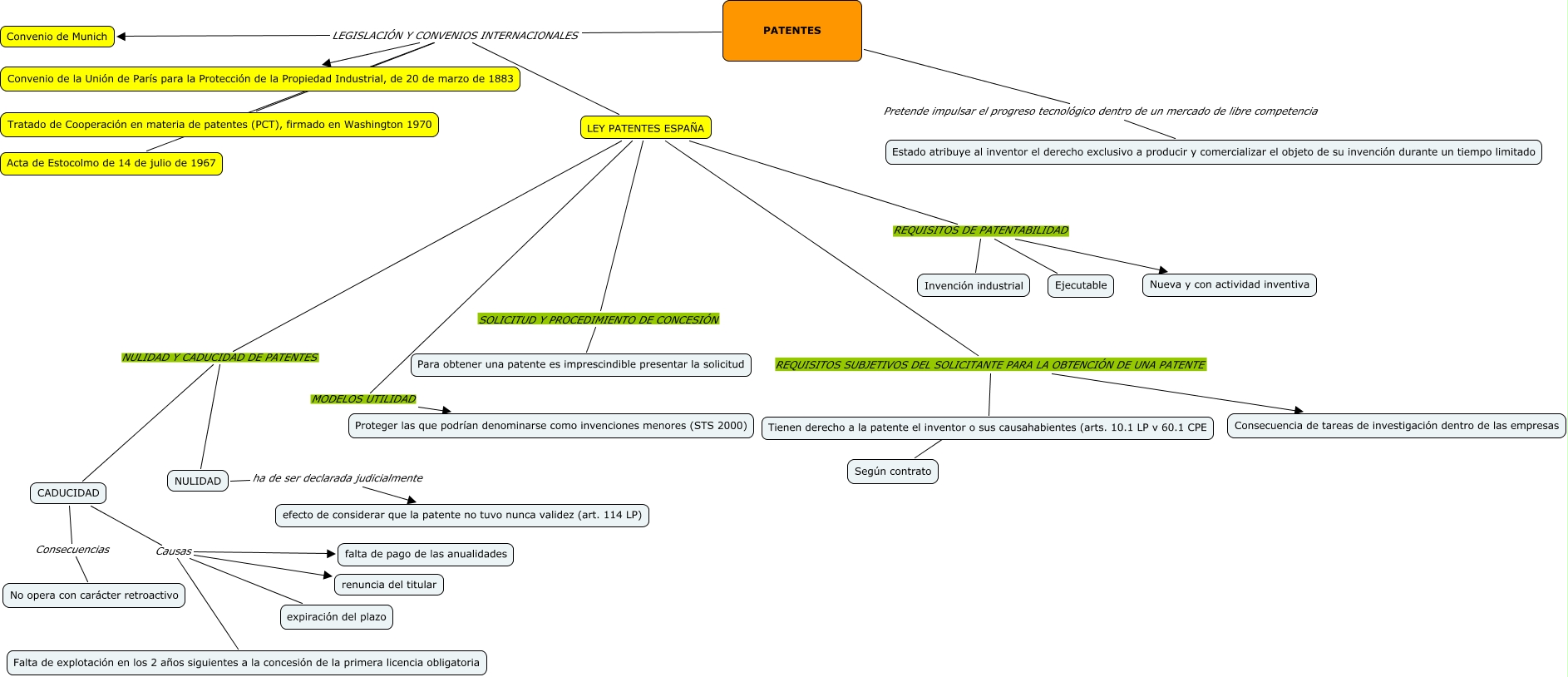 Este Cmap, tiene información relacionada con: Patentes, PATENTES LEGISLACIÓN Y CONVENIOS INTERNACIONALES Acta de Estocolmo de 14 de julio de 1967, PATENTES Pretende impulsar el progreso tecnológico dentro de un mercado de libre competencia Estado atribuye al inventor el derecho exclusivo a producir y comercializar el objeto de su invención durante un tiempo limitado, CADUCIDAD Causas expiración del plazo, NULIDAD ha de ser declarada judicialmente efecto de considerar que la patente no tuvo nunca validez (art. 114 LP), LEY PATENTES ESPAÑA MODELOS UTILIDAD Proteger las que podrían denominarse como invenciones menores (STS 2000), CADUCIDAD Causas falta de pago de las anualidades, PATENTES LEGISLACIÓN Y CONVENIOS INTERNACIONALES Convenio de la Unión de París para la Protección de la Propiedad Industrial, de 20 de marzo de 1883, LEY PATENTES ESPAÑA REQUISITOS SUBJETIVOS DEL SOLICITANTE PARA LA OBTENCIÓN DE UNA PATENTE Consecuencia de tareas de investigación dentro de las empresas, PATENTES LEGISLACIÓN Y CONVENIOS INTERNACIONALES LEY PATENTES ESPAÑA, LEY PATENTES ESPAÑA REQUISITOS DE PATENTABILIDAD Nueva y con actividad inventiva, LEY PATENTES ESPAÑA SOLICITUD Y PROCEDIMIENTO DE CONCESIÓN Para obtener una patente es imprescindible presentar la solicitud, Tienen derecho a la patente el inventor o sus causahabientes (arts. 10.1 LP v 60.1 CPE ???? Según contrato, LEY PATENTES ESPAÑA REQUISITOS DE PATENTABILIDAD Ejecutable, PATENTES LEGISLACIÓN Y CONVENIOS INTERNACIONALES Convenio de Munich, LEY PATENTES ESPAÑA REQUISITOS DE PATENTABILIDAD Invención industrial, LEY PATENTES ESPAÑA REQUISITOS SUBJETIVOS DEL SOLICITANTE PARA LA OBTENCIÓN DE UNA PATENTE Tienen derecho a la patente el inventor o sus causahabientes (arts. 10.1 LP v 60.1 CPE, LEY PATENTES ESPAÑA NULIDAD Y CADUCIDAD DE PATENTES CADUCIDAD, CADUCIDAD Causas renuncia del titular, CADUCIDAD Causas Falta de explotación en los 2 años siguientes a la concesión de la primera licencia obligatoria, PATENTES LEGISLACIÓN Y CONVENIOS INTERNACIONALES Tratado de Cooperación en materia de patentes (PCT), firmado en Washington 1970