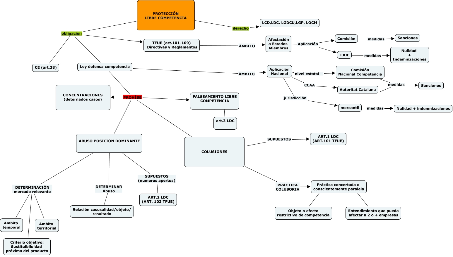 Este Cmap, tiene información relacionada con: Protección Libre Competencia, ABUSO POSICIÓN DOMINANTE SUPUESTOS (numerus apertus) ART.2 LDC (ART. 102 TFUE), ABUSO POSICIÓN DOMINANTE DETERMINACIÓN mercado relevante Criterio objetivo: Sustituibiloidad próxima del producto, ABUSO POSICIÓN DOMINANTE DETERMINAR Abuso Relación casusalidad/objeto/ resultado, Afectación a Estados Miembros Aplicación Comisión, Comisión Nacional Competencia medidas Sanciones, Ley defensa competencia ÁMBITO Aplicación Nacional, PROTECCIÓN LIBRE COMPETENCIA derecho LCD,LDC, LGDCU,LGP, LOCM, Ley defensa competencia PROHÍBE CONCENTRACIONES (deternados casos), mercantil medidas Nulidad + indemnizaciones, PROTECCIÓN LIBRE COMPETENCIA obligación TFUE (art.101-109) Directivas y Reglamentos, COLUSIONES SUPUESTOS ART.1 LDC (ART.101 TFUE), Ley defensa competencia PROHÍBE COLUSIONES, TFUE (art.101-109) Directivas y Reglamentos ÁMBITO Afectación a Estados Miembros, Aplicación Nacional CCAA Autoritat Catalana, COLUSIONES PRÁCTICA COLUSORIA Práctica concertada o conscientemente paralela, PROTECCIÓN LIBRE COMPETENCIA obligación CE (art.38), Ley defensa competencia PROHÍBE FALSEAMIENTO LIBRE COMPETENCIA, FALSEAMIENTO LIBRE COMPETENCIA Regulado art.3 LDC, PROTECCIÓN LIBRE COMPETENCIA obligación Ley defensa competencia, Práctica concertada o conscientemente paralela ???? Objeto o efecto restrictivo de competencia