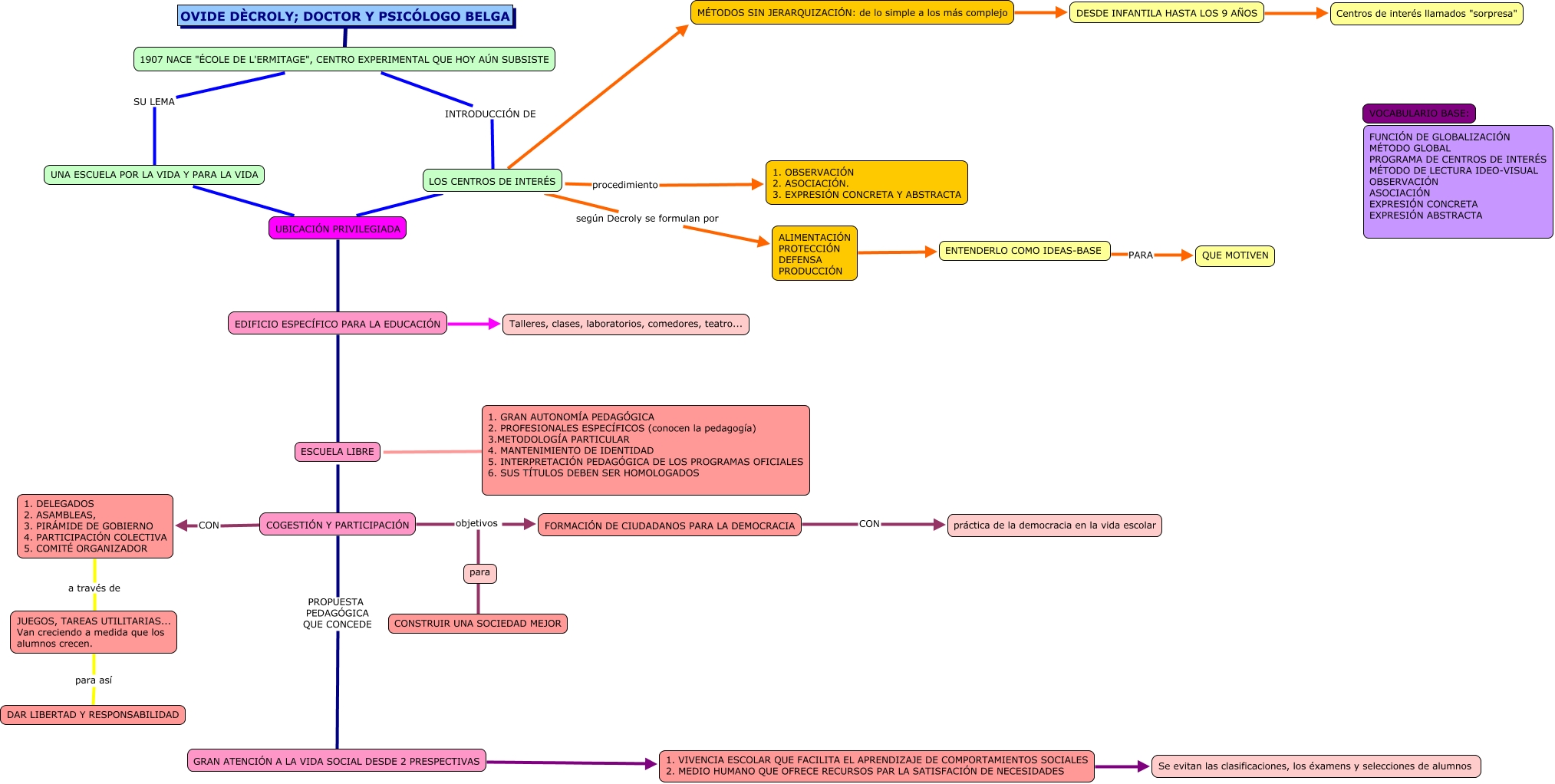 Este Cmap, tiene información relacionada con: EVA MASACHS, ESCUELA LIBRE COGESTIÓN Y PARTICIPACIÓN, ESCUELA LIBRE ???? 1. GRAN AUTONOMÍA PEDAGÓGICA 2. PROFESIONALES ESPECÍFICOS (conocen la pedagogía) 3.METODOLOGÍA PARTICULAR 4. MANTENIMIENTO DE IDENTIDAD 5. INTERPRETACIÓN PEDAGÓGICA DE LOS PROGRAMAS OFICIALES 6. SUS TÍTULOS DEBEN SER HOMOLOGADOS, LOS CENTROS DE INTERÉS MÉTODOS SIN JERARQUIZACIÓN: de lo simple a los más complejo, UNA ESCUELA POR LA VIDA Y PARA LA VIDA UBICACIÓN PRIVILEGIADA, LOS CENTROS DE INTERÉS según Decroly se formulan por ALIMENTACIÓN PROTECCIÓN DEFENSA PRODUCCIÓN, GRAN ATENCIÓN A LA VIDA SOCIAL DESDE 2 PRESPECTIVAS 1. VIVENCIA ESCOLAR QUE FACILITA EL APRENDIZAJE DE COMPORTAMIENTOS SOCIALES 2. MEDIO HUMANO QUE OFRECE RECURSOS PAR LA SATISFACIÓN DE NECESIDADES, COGESTIÓN Y PARTICIPACIÓN CON 1. DELEGADOS 2. ASAMBLEAS, 3. PIRÁMIDE DE GOBIERNO 4. PARTICIPACIÓN COLECTIVA 5. COMITÉ ORGANIZADOR, UBICACIÓN PRIVILEGIADA EDIFICIO ESPECÍFICO PARA LA EDUCACIÓN, ENTENDERLO COMO IDEAS-BASE PARA QUE MOTIVEN, COGESTIÓN Y PARTICIPACIÓN PROPUESTA PEDAGÓGICA QUE CONCEDE GRAN ATENCIÓN A LA VIDA SOCIAL DESDE 2 PRESPECTIVAS, DESDE INFANTILA HASTA LOS 9 AÑOS Centros de interés llamados "sorpresa", 1907 NACE "ÉCOLE DE L'ERMITAGE", CENTRO EXPERIMENTAL QUE HOY AÚN SUBSISTE INTRODUCCIÓN DE LOS CENTROS DE INTERÉS, COGESTIÓN Y PARTICIPACIÓN objetivos CONSTRUIR UNA SOCIEDAD MEJOR, OVIDE DÈCROLY; DOCTOR Y PSICÓLOGO BELGA 1907 NACE "ÉCOLE DE L'ERMITAGE", CENTRO EXPERIMENTAL QUE HOY AÚN SUBSISTE, COGESTIÓN Y PARTICIPACIÓN objetivos FORMACIÓN DE CIUDADANOS PARA LA DEMOCRACIA, JUEGOS, TAREAS UTILITARIAS... Van creciendo a medida que los alumnos crecen. para así DAR LIBERTAD Y RESPONSABILIDAD, EDIFICIO ESPECÍFICO PARA LA EDUCACIÓN ESCUELA LIBRE, LOS CENTROS DE INTERÉS procedimiento 1. OBSERVACIÓN 2. ASOCIACIÓN. 3. EXPRESIÓN CONCRETA Y ABSTRACTA, 1907 NACE "ÉCOLE DE L'ERMITAGE", CENTRO EXPERIMENTAL QUE HOY AÚN SUBSISTE SU LEMA UNA ESCUELA POR LA VIDA Y PARA LA VIDA, ALIMENTACIÓN PROTECCIÓN DEFENSA PRODUCCIÓN ENTENDERLO COMO IDEAS-BASE