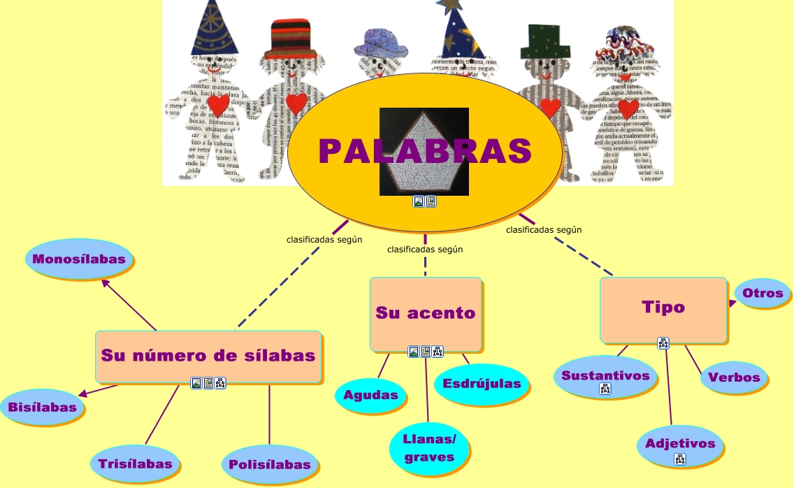 Este Cmap, tiene información relacionada con: Las palabras, Lengua Primaria, Su número de sílabas ???? Monosílabas, PALABRAS clasificadas según Tipo, Su número de sílabas ???? Polisílabas, Su número de sílabas ???? Bisílabas, PALABRAS clasificadas según Su número de sílabas, Su acento ???? Esdrújulas, Su número de sílabas T Trisílabas, Su acento ???? Llanas/ graves, Su acento ???? Agudas, Tipo Sustantivos, Tipo Adjetivos, PALABRAS clasificadas según Su acento, Tipo Verbos, Tipo Otros