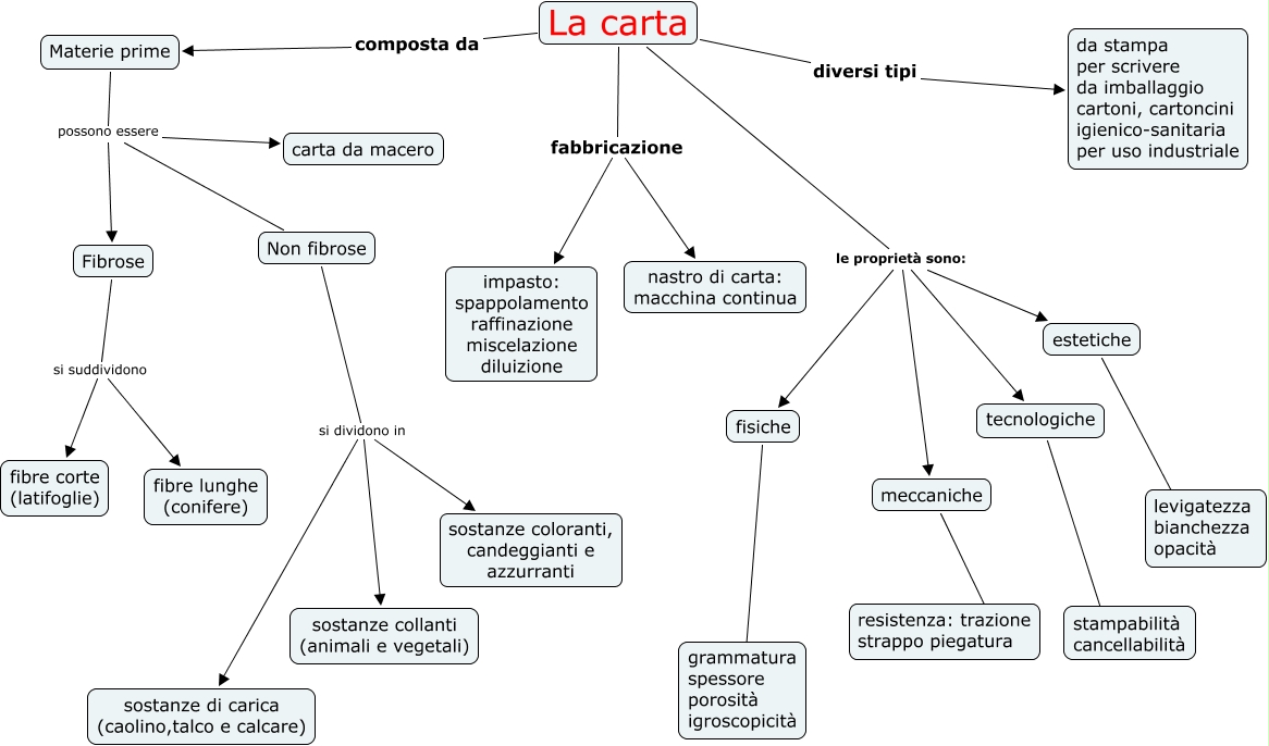 Questa Cmap, creata con IHMC CmapTools, contiene informazioni relative a: Carta, fisiche ???? grammatura spessore porosità igroscopicità, Non fibrose si dividono in sostanze di carica (caolino,talco e calcare), La carta diversi tipi da stampa per scrivere da imballaggio cartoni, cartoncini igienico-sanitaria per uso industriale, tecnologiche ???? stampabilità cancellabilità, La carta le proprietà sono: fisiche, Fibrose si suddividono fibre corte (latifoglie), estetiche ???? levigatezza bianchezza opacità, La carta composta da Materie prime, La carta le proprietà sono: tecnologiche, Materie prime possono essere Fibrose, meccaniche ???? resistenza: trazione strappo piegatura, Materie prime possono essere Non fibrose, La carta fabbricazione nastro di carta: macchina continua, La carta fabbricazione impasto: spappolamento raffinazione miscelazione diluizione, La carta le proprietà sono: meccaniche, Fibrose si suddividono fibre lunghe (conifere), La carta le proprietà sono: estetiche, Materie prime possono essere carta da macero, Non fibrose si dividono in sostanze coloranti, candeggianti e azzurranti, Non fibrose si dividono in sostanze collanti (animali e vegetali)