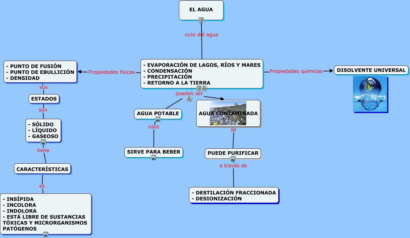 Este Cmap, tiene información relacionada con: EL AGUA, - EVAPORACIÓN DE LAGOS, RÍOS Y MARES - CONDENSACIÓN - PRECIPITACIÓN - RETORNO A LA TIERRA Propiedades físicas - PUNTO DE FUSIÓN - PUNTO DE EBULLICIÓN - DENSIDAD, EL AGUA ciclo del agua - EVAPORACIÓN DE LAGOS, RÍOS Y MARES - CONDENSACIÓN - PRECIPITACIÓN - RETORNO A LA TIERRA, EL AGUA ciclo del agua - EVAPORACIÓN DE LAGOS, RÍOS Y MARES - CONDENSACIÓN - PRECIPITACIÓN - RETORNO A LA TIERRA, - EVAPORACIÓN DE LAGOS, RÍOS Y MARES - CONDENSACIÓN - PRECIPITACIÓN - RETORNO A LA TIERRA pueden ser AGUA POTABLE, EL AGUA ciclo del agua - EVAPORACIÓN DE LAGOS, RÍOS Y MARES - CONDENSACIÓN - PRECIPITACIÓN - RETORNO A LA TIERRA, EL AGUA ciclo del agua - EVAPORACIÓN DE LAGOS, RÍOS Y MARES - CONDENSACIÓN - PRECIPITACIÓN - RETORNO A LA TIERRA, - SÓLIDO - LÍQUIDO - GASEOSO tiene ????, - PUNTO DE FUSIÓN - PUNTO DE EBULLICIÓN - DENSIDAD sus ESTADOS, ESTADOS son - SÓLIDO - LÍQUIDO - GASEOSO, - EVAPORACIÓN DE LAGOS, RÍOS Y MARES - CONDENSACIÓN - PRECIPITACIÓN - RETORNO A LA TIERRA pueden ser AGUA CONTAMINADA, EL AGUA ciclo del agua - EVAPORACIÓN DE LAGOS, RÍOS Y MARES - CONDENSACIÓN - PRECIPITACIÓN - RETORNO A LA TIERRA, - EVAPORACIÓN DE LAGOS, RÍOS Y MARES - CONDENSACIÓN - PRECIPITACIÓN - RETORNO A LA TIERRA Propiedades químicas DISOLVENTE UNIVERSAL, EL AGUA ciclo del agua - EVAPORACIÓN DE LAGOS, RÍOS Y MARES - CONDENSACIÓN - PRECIPITACIÓN - RETORNO A LA TIERRA, EL AGUA ciclo del agua - EVAPORACIÓN DE LAGOS, RÍOS Y MARES - CONDENSACIÓN - PRECIPITACIÓN - RETORNO A LA TIERRA, EL AGUA ciclo del agua - EVAPORACIÓN DE LAGOS, RÍOS Y MARES - CONDENSACIÓN - PRECIPITACIÓN - RETORNO A LA TIERRA, AGUA CONTAMINADA se PUEDE PURIFICAR, CARACTERÍSTICAS es - INSÍPIDA - INCOLORA - INDOLORA - ESTÁ LIBRE DE SUSTANCIAS TÓXICAS Y MICRORGANISMOS PATÓGENOS, AGUA POTABLE usos SIRVE PARA BEBER, EL AGUA ciclo del agua - EVAPORACIÓN DE LAGOS, RÍOS Y MARES - CONDENSACIÓN - PRECIPITACIÓN - RETORNO A LA TIERRA, PUEDE PURIFICAR a través de - DESTILACIÓN FRACCIONADA - DESIONIZACIÓN