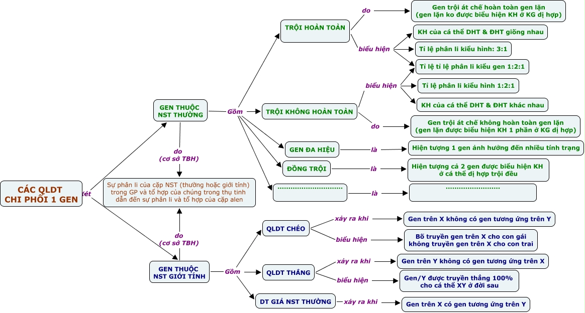 This Concept Map, created with IHMC CmapTools, has information related to: 1gen, TRỘI HOÀN TOÀN biểu hiện KH của cá thể DHT & ĐHT giống nhau, GEN THUỘC NST GIỚI TÍNH Gồm QLDT CHÉO, QLDT CHÉO xảy ra khi Gen trên X không có gen tương ứng trên Y, TRỘI KHÔNG HOÀN TOÀN do Gen trội át chế không hoàn toàn gen lặn (gen lặn được biểu hiện KH 1 phần ở KG dị hợp), GEN THUỘC NST THƯỜNG Gồm GEN ĐA HIỆU, CÁC QLDT CHI PHỐI 1 GEN Xét GEN THUỘC NST THƯỜNG, QLDT CHÉO biểu hiện Bố truyền gen trên X cho con gái không truyền gen trên X cho con trai, GEN THUỘC NST THƯỜNG Gồm TRỘI HOÀN TOÀN, TRỘI KHÔNG HOÀN TOÀN biểu hiện KH của cá thể DHT & ĐHT khác nhau, TRỘI HOÀN TOÀN do Gen trội át chế hoàn toàn gen lặn (gen lặn ko được biểu hiện KH ở KG dị hợp), TRỘI HOÀN TOÀN biểu hiện Tỉ lệ phân li kiểu hình: 3:1, GEN THUỘC NST THƯỜNG do (cơ sở TBH) Sự phân li của cặp NST (thường hoặc giới tính) trong GP và tổ hợp của chúng trong thụ tinh dẫn đến sự phân li và tổ hợp của cặp alen, GEN THUỘC NST THƯỜNG Gồm ĐỒNG TRỘI, GEN THUỘC NST THƯỜNG Gồm TRỘI KHÔNG HOÀN TOÀN, GEN ĐA HIỆU là Hiện tượng 1 gen ảnh hưởng đến nhiều tính trạng, ĐỒNG TRỘI là Hiện tượng cả 2 gen được biểu hiện KH ở cá thể dị hợp trội đều, GEN THUỘC NST THƯỜNG Gồm .............................., GEN THUỘC NST GIỚI TÍNH do (cơ sở TBH) Sự phân li của cặp NST (thường hoặc giới tính) trong GP và tổ hợp của chúng trong thụ tinh dẫn đến sự phân li và tổ hợp của cặp alen, TRỘI HOÀN TOÀN biểu hiện Tỉ lệ tỉ lệ phân li kiểu gen 1:2:1, QLDT THẲNG xảy ra khi Gen trên Y không có gen tương ứng trên X