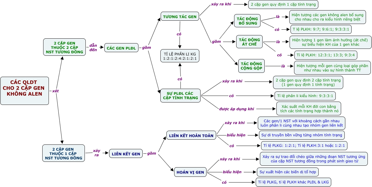 This Concept Map, created with IHMC CmapTools, has information related to: 2 cặp gen, HOÁN VỊ GEN xảy ra khi Xảy ra sự trao đổi chéo giữa những đoạn NST tương ứng của cặp NST tương đồng trong phát sinh giao tử, SỰ PLĐL CÁC CẶP TÍNH TRẠNG được áp dụng khi Xác suất mỗi KH đời con bằng tích các tính trạng hợp thành nó, TÁC ĐỘNG CỘNG GỘP là Hiện tượng mỗi gen cùng loại góp phần như nhau vào sự hình thành TT, HOÁN VỊ GEN có Tỉ lệ PLKG, tỉ lệ PLKH khác PLĐL & LKG, SỰ PLĐL CÁC CẶP TÍNH TRẠNG có Tỉ lệ phân li kiểu hình: 9:3:3:1, TƯƠNG TÁC GEN có TỈ LỆ PHÂN LI KG 1:2:1:2:4:2:1:2:1, LIÊN KẾT HOÀN TOÀN có Tỉ lệ PLKG: 1:2:1; Tỉ lệ PLKH:3:1 hoặc 1:2:1, LIÊN KẾT GEN gồm HOÁN VỊ GEN, 2 CẶP GEN THUỘC 2 CẶP NST TƯƠNG ĐỒNG dẫn đến CÁC GEN PLĐL, CÁC GEN PLĐL gồm TƯƠNG TÁC GEN, SỰ PLĐL CÁC CẶP TÍNH TRẠNG có TỈ LỆ PHÂN LI KG 1:2:1:2:4:2:1:2:1, TƯƠNG TÁC GEN xảy ra khi 2 cặp gen quy định 1 cặp tính trạng, HOÁN VỊ GEN biểu hiện Sự xuất hiện các biến dị tổ hợp, LIÊN KẾT GEN gồm LIÊN KẾT HOÀN TOÀN, TƯƠNG TÁC GEN gồm TÁC ĐỘNG ÁT CHẾ, SỰ PLĐL CÁC CẶP TÍNH TRẠNG xảy ra khi 2 cặp gen quy định 2 cặp tính trạng (1 gen quy định 1 tính trạng), TÁC ĐỘNG BỔ SUNG có T lệ PLKH: 9:7; 9:6:1; 9:3:3:1, TÁC ĐỘNG ÁT CHẾ là Hiện tượng 1 gen làm ảnh hưởng (át chế) sự biểu hiện KH của 1 gen khác, LIÊN KẾT HOÀN TOÀN xảy ra khi Các gen/1 NST với khoảng cách gần nhau luôn phân li cùng nhau tạo nhóm gen liên kết, TÁC ĐỘNG BỔ SUNG là Hiện tượng các gen không alen bổ sung cho nhau cho ra kiểu hình riêng biệt