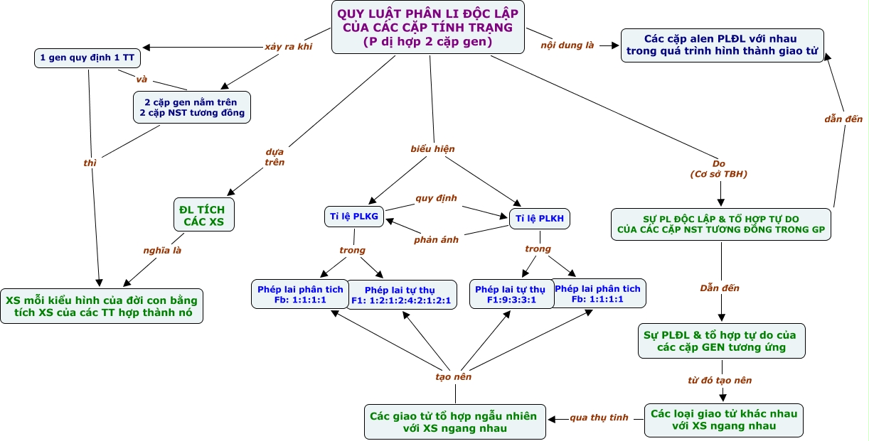 This Concept Map, created with IHMC CmapTools, has information related to: QLPLĐL, Các giao tử tổ hợp ngẫu nhiên với XS ngang nhau tạo nên Phép lai phân tich Fb: 1:1:1:1, Các giao tử tổ hợp ngẫu nhiên với XS ngang nhau tạo nên Phép lai phân tich Fb: 1:1:1:1, QUY LUẬT PHÂN LI ĐỘC LẬP CỦA CÁC CẶP TÍNH TRẠNG (P dị hợp 2 cặp gen) nội dung là Các cặp alen PLĐL với nhau trong quá trình hình thành giao tử, Sự PLĐL & tổ hợp tự do của các cặp GEN tương ứng từ đó tạo nên Các loại giao tử khác nhau với XS ngang nhau, QUY LUẬT PHÂN LI ĐỘC LẬP CỦA CÁC CẶP TÍNH TRẠNG (P dị hợp 2 cặp gen) biểu hiện Tỉ lệ PLKH, Tỉ lệ PLKH trong Phép lai phân tich Fb: 1:1:1:1, QUY LUẬT PHÂN LI ĐỘC LẬP CỦA CÁC CẶP TÍNH TRẠNG (P dị hợp 2 cặp gen) biểu hiện Tỉ lệ PLKG, 2 cặp gen nằm trên 2 cặp NST tương đồng thì XS mỗi kiểu hình của đời con bằng tích XS của các TT hợp thành nó, Tỉ lệ PLKH trong Phép lai tự thụ F1:9:3:3:1, 1 gen quy định 1 TT và 2 cặp gen nằm trên 2 cặp NST tương đồng, SỰ PL ĐỘC LẬP & TỔ HỢP TỰ DO CỦA CÁC CẶP NST TƯƠNG ĐỒNG TRONG GP Dẫn đến Sự PLĐL & tổ hợp tự do của các cặp GEN tương ứng, SỰ PL ĐỘC LẬP & TỔ HỢP TỰ DO CỦA CÁC CẶP NST TƯƠNG ĐỒNG TRONG GP dẫn đến Các cặp alen PLĐL với nhau trong quá trình hình thành giao tử, Tỉ lệ PLKG quy định Tỉ lệ PLKH, Các giao tử tổ hợp ngẫu nhiên với XS ngang nhau tạo nên Phép lai tự thụ F1: 1:2:1:2:4:2:1:2:1, QUY LUẬT PHÂN LI ĐỘC LẬP CỦA CÁC CẶP TÍNH TRẠNG (P dị hợp 2 cặp gen) Do (Cơ sở TBH) SỰ PL ĐỘC LẬP & TỔ HỢP TỰ DO CỦA CÁC CẶP NST TƯƠNG ĐỒNG TRONG GP, Tỉ lệ PLKH phản ánh Tỉ lệ PLKG, ĐL TÍCH CÁC XS nghĩa là XS mỗi kiểu hình của đời con bằng tích XS của các TT hợp thành nó, Tỉ lệ PLKG trong Phép lai phân tich Fb: 1:1:1:1, Tỉ lệ PLKG trong Phép lai tự thụ F1: 1:2:1:2:4:2:1:2:1, Các giao tử tổ hợp ngẫu nhiên với XS ngang nhau tạo nên Phép lai tự thụ F1:9:3:3:1