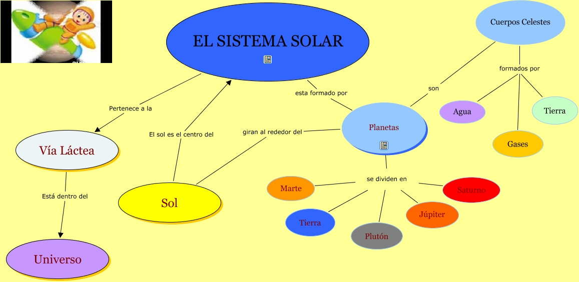 Este Cmap, tiene información relacionada con: EL SISTEMA SOLAR, Planetas se dividen en Marte, Planetas son Cuerpos Celestes, EL SISTEMA SOLAR esta formado por Planetas, Planetas se dividen en Júpiter, Agua formados por Gases, Planetas se dividen en Tierra, Tierra formados por Gases, EL SISTEMA SOLAR Pertenece a la Vía Láctea, Planetas se dividen en Plutón, Cuerpos Celestes formados por Gases, Vía Láctea Está dentro del Universo, Planetas se dividen en Saturno, Sol El sol es el centro del EL SISTEMA SOLAR, Planetas giran al rededor del Sol