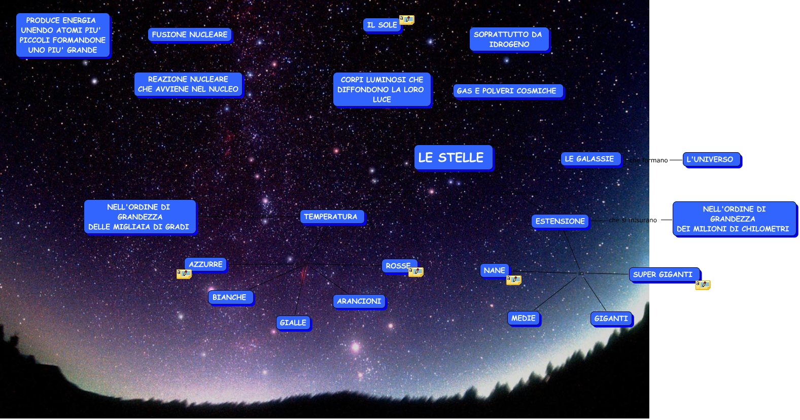 Questa Cmap, creata con IHMC CmapTools, contiene informazioni relative a: Le stelle 2, TEMPERATURA in AZZURRE, TEMPERATURA in GIALLE, CORPI LUMINOSI CHE DIFFONDONO LA LORO LUCE come IL SOLE, TEMPERATURA in ARANCIONI, ESTENSIONE in MEDIE, LE GALASSIE che formano L'UNIVERSO, LE STELLE sono CORPI LUMINOSI CHE DIFFONDONO LA LORO LUCE, TEMPERATURA in BIANCHE, LE STELLE sono GAS E POLVERI COSMICHE, GAS E POLVERI COSMICHE formate SOPRATTUTTO DA IDROGENO, ESTENSIONE in SUPER GIGANTI, ESTENSIONE in NANE, LE STELLE formano LE GALASSIE, CORPI LUMINOSI CHE DIFFONDONO LA LORO LUCE che dipende da una REAZIONE NUCLEARE CHE AVVIENE NEL NUCLEO, REAZIONE NUCLEARE CHE AVVIENE NEL NUCLEO cioè FUSIONE NUCLEARE, TEMPERATURA che si misurano NELL'ORDINE DI GRANDEZZA DELLE MIGLIAIA DI GRADI, ESTENSIONE che si misurano NELL'ORDINE DI GRANDEZZA DEI MILIONI DI CHILOMETRI, FUSIONE NUCLEARE che PRODUCE ENERGIA UNENDO ATOMI PIU' PICCOLI FORMANDONE UNO PIU' GRANDE, LE STELLE si dividono per ESTENSIONE, ESTENSIONE in GIGANTI