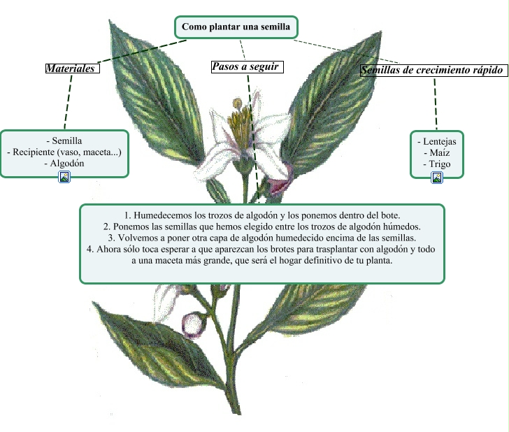 Este Cmap, tiene información relacionada con: Cómo plantar una planta, Como plantar una semilla Semillas de crecimiento rápido - Lentejas - Maíz - Trigo, Como plantar una semilla Pasos a seguir 1. Humedecemos los trozos de algodón y los ponemos dentro del bote. 2. Ponemos las semillas que hemos elegido entre los trozos de algodón húmedos. 3. Volvemos a poner otra capa de algodón humedecido encima de las semillas. 4. Ahora sólo toca esperar a que aparezcan los brotes para trasplantar con algodón y todo a una maceta más grande, que será el hogar definitivo de tu planta., Como plantar una semilla Materiales - Semilla - Recipiente (vaso, maceta...) - Algodón, Como plantar una semilla Materiales - Semilla - Recipiente (vaso, maceta...) - Algodón