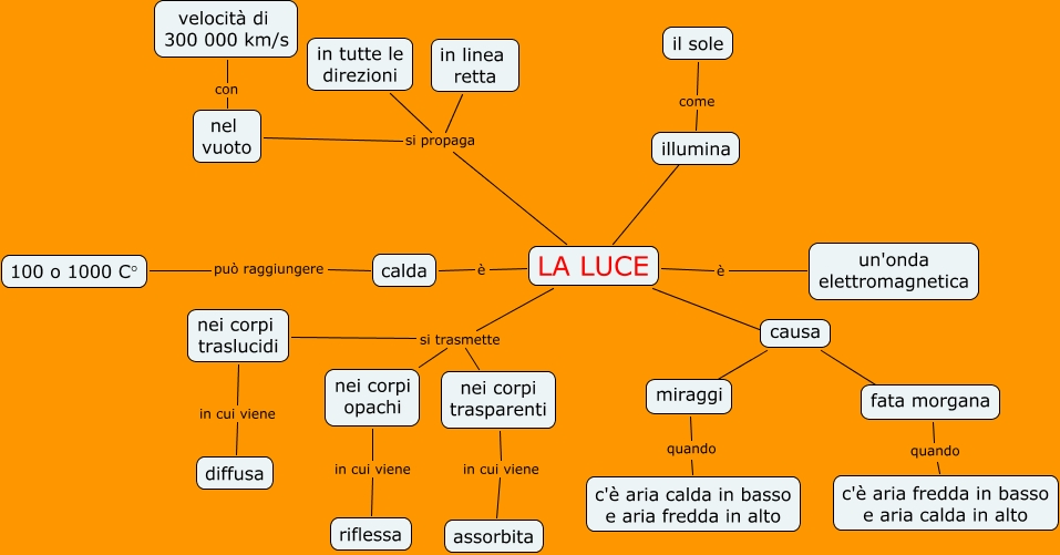 Questa Cmap, creata con IHMC CmapTools, contiene informazioni relative a: La luce, LA LUCE si trasmette nei corpi traslucidi, calda può raggiungere 100 o 1000 C°, nei corpi traslucidi in cui viene diffusa, causa ???? miraggi, LA LUCE si trasmette nei corpi opachi, fata morgana quando c'è aria fredda in basso e aria calda in alto, LA LUCE ???? illumina, LA LUCE si propaga nel vuoto, LA LUCE è un'onda elettromagnetica, LA LUCE si propaga in tutte le direzioni, miraggi quando c'è aria calda in basso e aria fredda in alto, LA LUCE ???? causa, nei corpi opachi in cui viene riflessa, LA LUCE si trasmette nei corpi trasparenti, causa ???? fata morgana, LA LUCE è calda, nel vuoto con velocità di 300 000 km/s, illumina come il sole, nei corpi trasparenti in cui viene assorbita, LA LUCE si propaga in linea retta