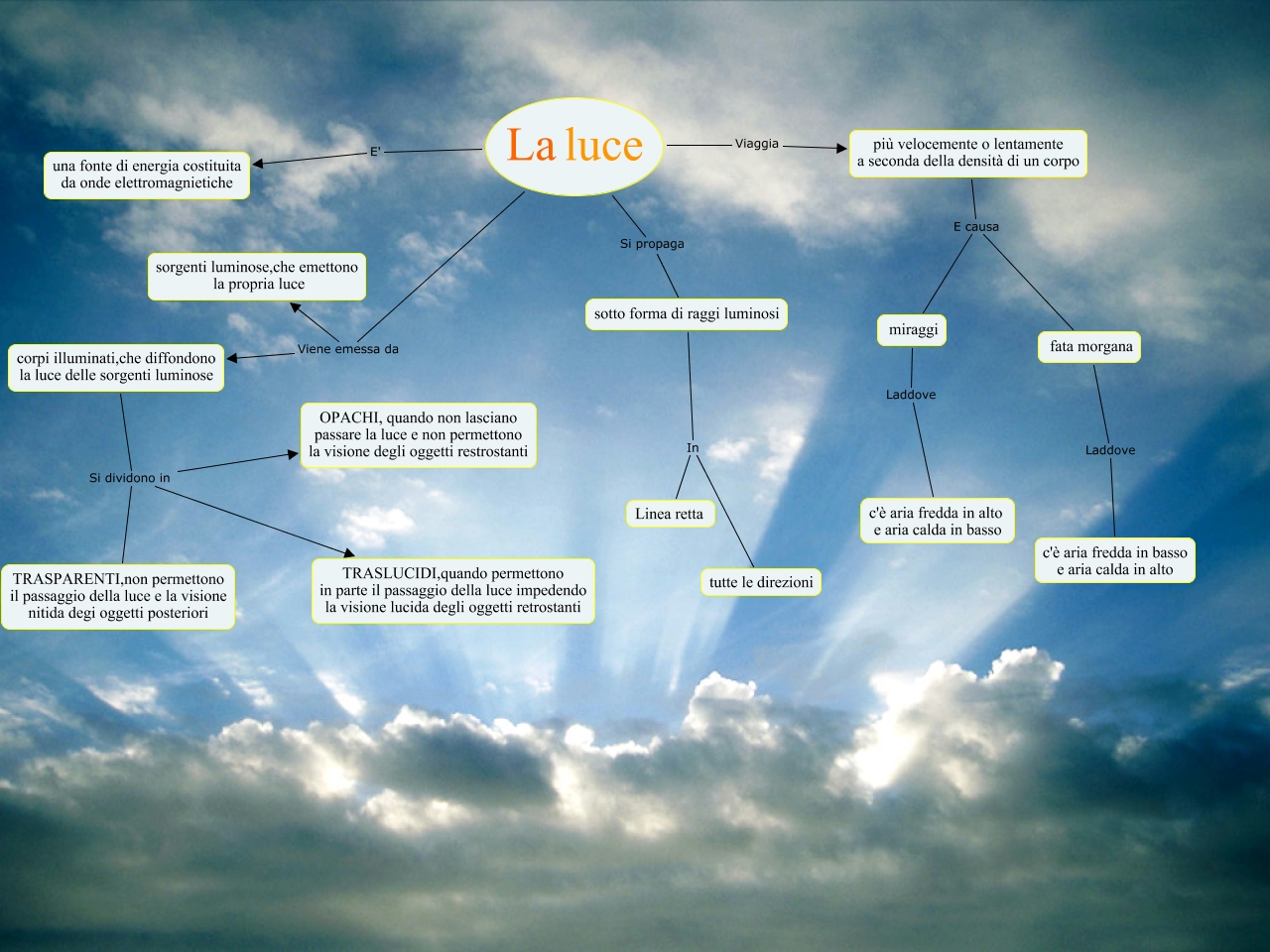 Questa Cmap, creata con IHMC CmapTools, contiene informazioni relative a: La luce, fata morgana Laddove c'è aria fredda in basso e aria calda in alto, corpi illuminati,che diffondono la luce delle sorgenti luminose Si dividono in TRASPARENTI,non permettono il passaggio della luce e la visione nitida degi oggetti posteriori, sotto forma di raggi luminosi In Linea retta, La luce Si propaga sotto forma di raggi luminosi, La luce Viene emessa da corpi illuminati,che diffondono la luce delle sorgenti luminose, più velocemente o lentamente a seconda della densità di un corpo E causa fata morgana, La luce Viaggia più velocemente o lentamente a seconda della densità di un corpo, sotto forma di raggi luminosi In tutte le direzioni, corpi illuminati,che diffondono la luce delle sorgenti luminose Si dividono in TRASLUCIDI,quando permettono in parte il passaggio della luce impedendo la visione lucida degli oggetti retrostanti, corpi illuminati,che diffondono la luce delle sorgenti luminose Si dividono in OPACHI, quando non lasciano passare la luce e non permettono la visione degli oggetti restrostanti, La luce Viene emessa da sorgenti luminose,che emettono la propria luce, La luce E' una fonte di energia costituita da onde elettromagnietiche, miraggi Laddove c'è aria fredda in alto e aria calda in basso, più velocemente o lentamente a seconda della densità di un corpo E causa miraggi