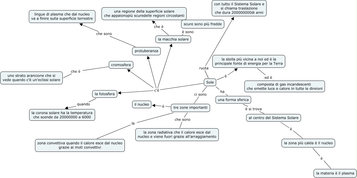 Questa Cmap, creata con IHMC CmapTools, contiene informazioni relative a: il Sole, Sole ruota con tutto il Sistema Solare e si chiama traslazione che dura 200000000di anni, Sole ha una forma sferica, una forma sferica è si trova al centro del Sistema Solare, la zona più calda è il nucleo è la materia è il plasma, Sole c'è protuberanza, al centro del Sistema Solare è la zona più calda è il nucleo, la fotosfera quando la corona solare ha la temperatura che scende da 20000000 a 6000, tre zone importanti è il nucleo, Sole ci sono tre zone importanti, Sole è la stella più vicina a noi ed è la principale fonte di energia per la Terra, la macchia solare che è una regione della superficie solare che appaionopiù scuredelle regioni circostanti, protuberanza che sono lingue di plasma che dal nucleo va a finire sulla superficie terrestre, Sole c'è la macchia solare, la macchia solare è sono scure sono più fredde, tre zone importanti la zona convettiva quando il calore esce dal nucleo grazie ai moti convettivi, cromosfera che è uno strato arancione che si vede quando c'è un'eclissi solare, tre zone importanti che sono la zona radiativa che il calore esce dal nucleo e viene fuori grazie all'arraggiamento, Sole c'è la fotosfera, Sole c'è cromosfera, la stella più vicina a noi ed è la principale fonte di energia per la Terra ed è composta di gas incandescenti che emette luce e calore in tutte le direioni