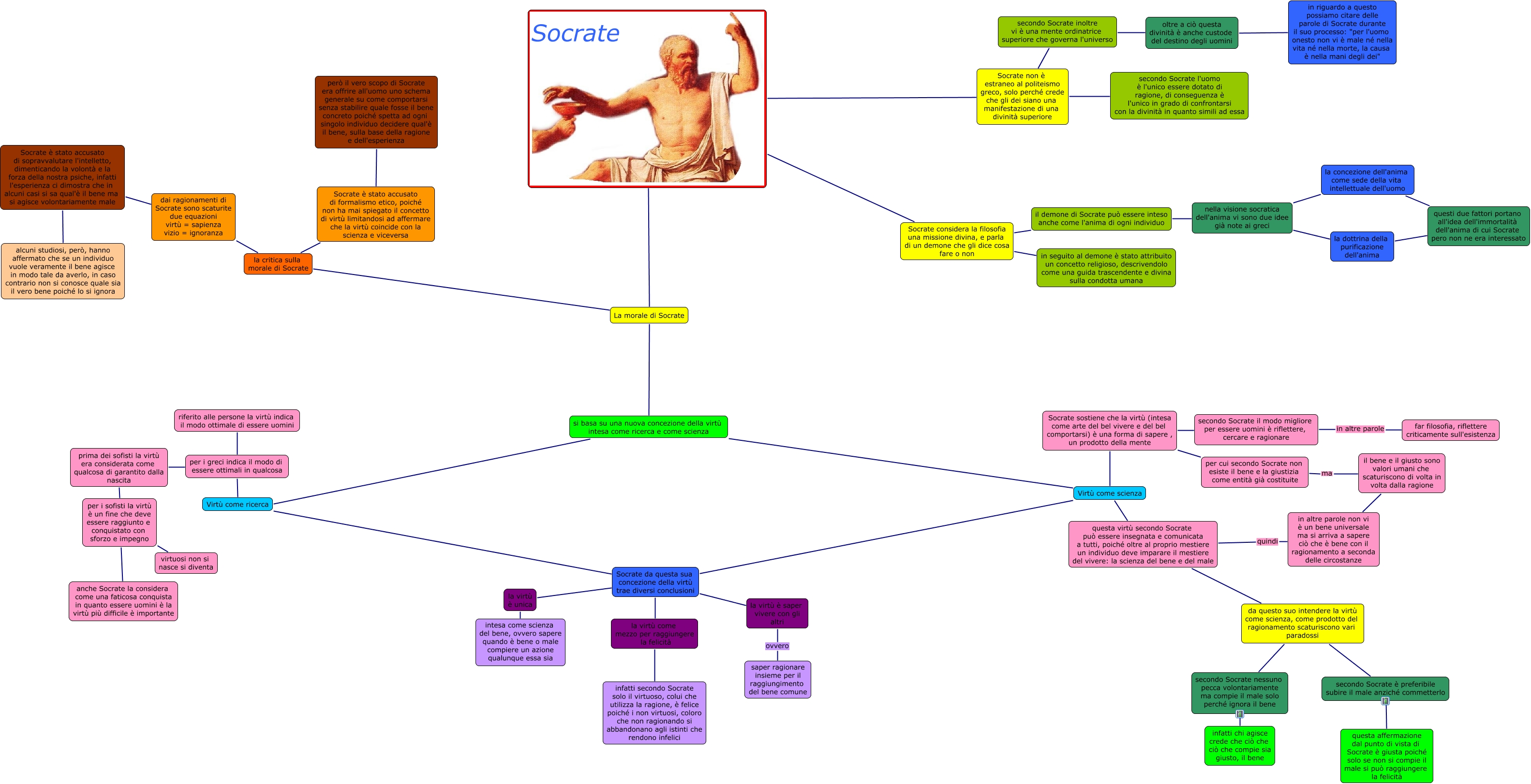 Questa Cmap, creata con IHMC CmapTools, contiene informazioni relative a: Mappa sulla morale di Socrate, Socrate Socrate considera la filosofia una missione divina, e parla di un demone che gli dice cosa fare o non, Socrate da questa sua concezione della virtù trae diversi conclusioni la virtù come mezzo per raggiungere la felicità, Socrate è stato accusato di sopravvalutare l'intelletto, dimenticando la volontà e la forza della nostra psiche, infatti l'esperienza ci dimostra che in alcuni casi si sa qual'è il bene ma si agisce volontariamente male alcuni studiosi, però, hanno affermato che se un individuo vuole veramente il bene agisce in modo tale da averlo, in caso contrario non si conosce quale sia il vero bene poiché lo si ignora, oltre a ciò questa divinità è anche custode del destino degli uomini in riguardo a questo possiamo citare delle parole di Socrate durante il suo processo: "per l'uomo onesto non vi è male né nella vita né nella morte, la causa è nella mani degli dei", la critica sulla morale di Socrate Socrate è stato accusato di formalismo etico, poiché non ha mai spiegato il concetto di virtù limitandosi ad affermare che la virtù coincide con la scienza e viceversa, Socrate non è estraneo al politeismo greco, solo perché crede che gli dei siano una manifestazione di una divinità superiore secondo Socrate l'uomo è l'unico essere dotato di ragione, di conseguenza è l'unico in grado di confrontarsi con la divinità in quanto simili ad essa, la virtù è unica intesa come scienza del bene, ovvero sapere quando è bene o male compiere un azione qualunque essa sia, per i sofisti la virtù è un fine che deve essere raggiunto e conquistato con sforzo e impegno anche Socrate la considera come una faticosa conquista in quanto essere uomini è la virtù più difficile è importante, La morale di Socrate si basa su una nuova concezione della virtù intesa come ricerca e come scienza, Virtù come scienza questa virtù secondo Socrate può essere insegnata e comunicata a tutti, poiché oltre al proprio mestiere un individuo deve imparare il mestiere del vivere: la scienza del bene e del male, prima dei sofisti la virtù era considerata come qualcosa di garantito dalla nascita per i sofisti la virtù è un fine che deve essere raggiunto e conquistato con sforzo e impegno, nella visione socratica dell'anima vi sono due idee già note ai greci la dottrina della purificazione dell'anima, Socrate non è estraneo al politeismo greco, solo perché crede che gli dei siano una manifestazione di una divinità superiore secondo Socrate inoltre vi è una mente ordinatrice superiore che governa l'universo, per i greci indica il modo di essere ottimali in qualcosa riferito alle persone la virtù indica il modo ottimale di essere uomini, il bene e il giusto sono valori umani che scaturiscono di volta in volta dalla ragione in altre parole non vi è un bene universale ma si arriva a sapere ciò che è bene con il ragionamento a seconda delle circostanze, Virtù come ricerca per i greci indica il modo di essere ottimali in qualcosa, Socrate è stato accusato di formalismo etico, poiché non ha mai spiegato il concetto di virtù limitandosi ad affermare che la virtù coincide con la scienza e viceversa però il vero scopo di Socrate era offrire all'uomo uno schema generale su come comportarsi senza stabilire quale fosse il bene concreto poiché spetta ad ogni singolo individuo decidere qual'è il bene, sulla base della ragione e dell'esperienza, si basa su una nuova concezione della virtù intesa come ricerca e come scienza Virtù come scienza, La morale di Socrate Socrate, per i sofisti la virtù è un fine che deve essere raggiunto e conquistato con sforzo e impegno virtuosi non si nasce si diventa