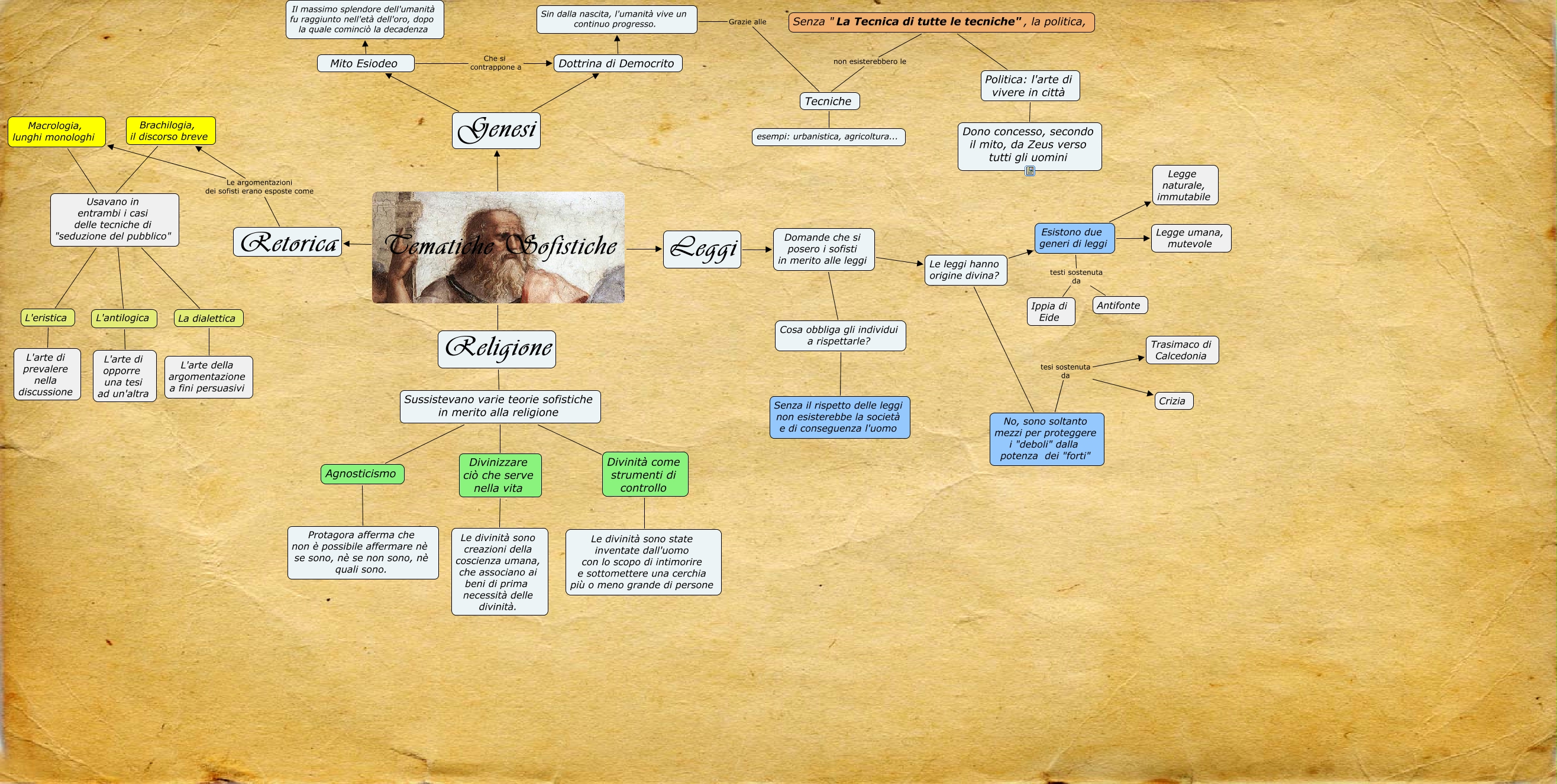 Questa Cmap, creata con IHMC CmapTools, contiene informazioni relative a: Le questioni Sofistiche, Esistono due generi di leggi Legge naturale, immutabile, Mito Esiodeo Il massimo splendore dell'umanità fu raggiunto nell'età dell'oro, dopo la quale cominciò la decadenza, Tecniche esempi: urbanistica, agricoltura..., Divinizzare ciò che serve nella vita Le divinità sono creazioni della coscienza umana, che associano ai beni di prima necessità delle divinità., Domande che si posero i sofisti in merito alle leggi Cosa obbliga gli individui a rispettarle?, Usavano in entrambi i casi delle tecniche di "seduzione del pubblico" L'eristica, No, sono soltanto mezzi per proteggere i "deboli" dalla potenza dei "forti" tesi sostenuta da Crizia, Retorica Le argomentazioni dei sofisti erano esposte come Brachilogia, il discorso breve, Mito Esiodeo Che si contrappone a Dottrina di Democrito, Politica: l'arte di vivere in città Dono concesso, secondo il mito, da Zeus verso tutti gli uomini, L'antilogica L'arte di opporre una tesi ad un'altra, Dottrina di Democrito Sin dalla nascita, l'umanità vive un continuo progresso., Tematiche Sofistiche Genesi, Tematiche Sofistiche Religione, Genesi Mito Esiodeo, Brachilogia, il discorso breve Usavano in entrambi i casi delle tecniche di "seduzione del pubblico", Usavano in entrambi i casi delle tecniche di "seduzione del pubblico" La dialettica, Esistono due generi di leggi testi sostenuta da Antifonte, Sussistevano varie teorie sofistiche in merito alla religione Agnosticismo, Leggi Domande che si posero i sofisti in merito alle leggi