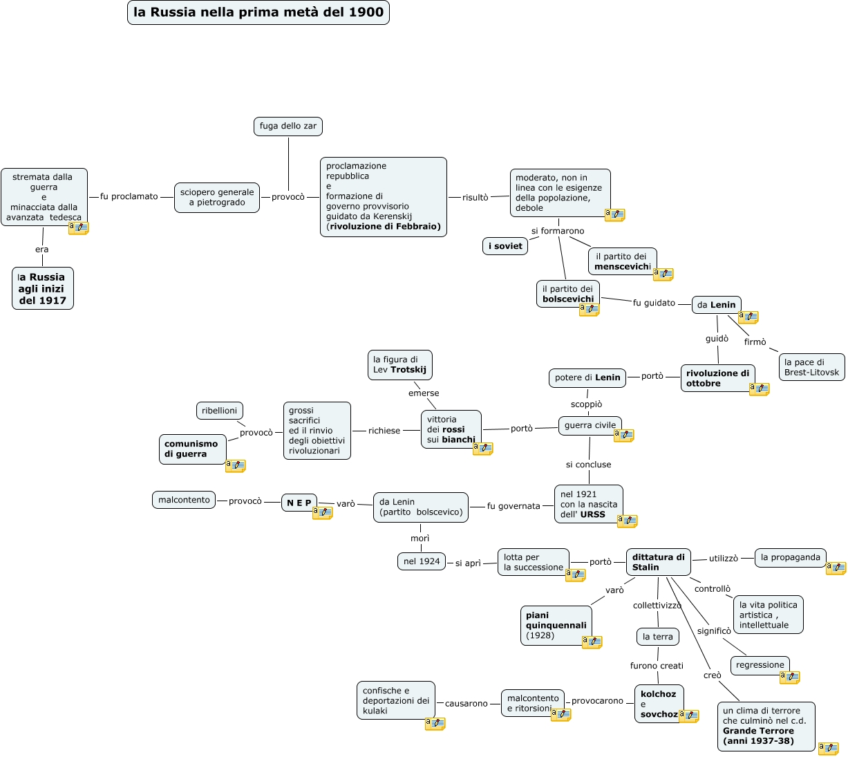 Questa Cmap, creata con IHMC CmapTools, contiene informazioni relative a: 5) La Russia nella I° metà del 1900 (AA), guerra civile si concluse nel 1921 con la nascita dell' URSS, grossi sacrifici ed il rinvio degli obiettivi rivoluzionari provocò ribellioni, dittatura di Stalin varò piani quinquennali (1928), da Lenin firmò la pace di Brest-Litovsk, da Lenin (partito bolscevico) morì nel 1924, potere di Lenin scoppiò guerra civile, lotta per la successione portò dittatura di Stalin, dittatura di Stalin controllò la vita politica artistica , intellettuale, il partito dei bolscevichi fu guidato da Lenin, nel 1921 con la nascita dell' URSS fu governata da Lenin (partito bolscevico), dittatura di Stalin collettivizzò la terra, rivoluzione di ottobre portò potere di Lenin, stremata dalla guerra e minacciata dalla avanzata tedesca fu proclamato sciopero generale a pietrogrado, grossi sacrifici ed il rinvio degli obiettivi rivoluzionari provocò comunismo di guerra, la terra furono creati kolchoz e sovchoz, da Lenin guidò rivoluzione di ottobre, nel 1924 si aprì lotta per la successione, moderato, non in linea con le esigenze della popolazione, debole si formarono il partito dei menscevichi, dittatura di Stalin significò regressione, proclamazione repubblica e formazione di governo provvisorio guidato da Kerenskij (rivoluzione di Febbraio) risultò moderato, non in linea con le esigenze della popolazione, debole