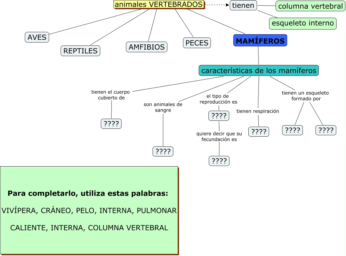 Este Cmap, tiene información relacionada con: los mamíferos, animales VERTEBRADOS ???? AMFIBIOS, tienen ???? columna vertebral, MAMÍFEROS ???? características de los mamíferos, características de los mamíferos tienen un esqueleto formado por ????, animales VERTEBRADOS ???? PECES, características de los mamíferos tienen respiración ????, animales VERTEBRADOS ???? tienen, animales VERTEBRADOS ???? REPTILES, características de los mamíferos el tipo de reproducción es ????, tienen ???? esqueleto interno, animales VERTEBRADOS ???? MAMÍFEROS, ???? quiere decir que su fecundación es ????, características de los mamíferos tienen el cuerpo cubierto de ????, características de los mamíferos son animales de sangre ????, características de los mamíferos tienen un esqueleto formado por ????, animales VERTEBRADOS ???? AVES