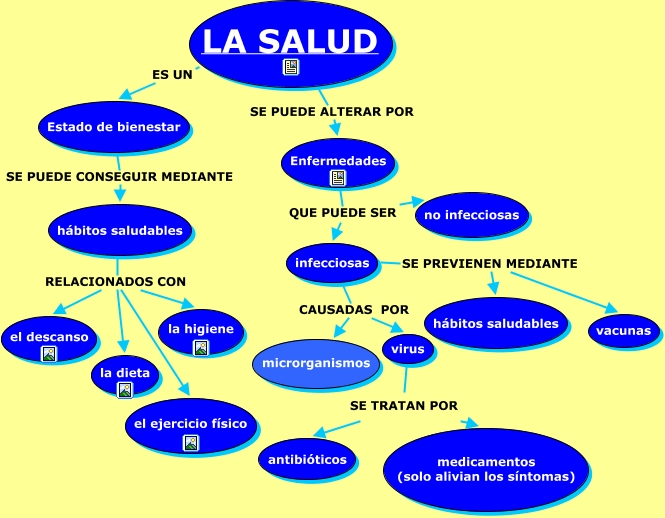Este Cmap, tiene información relacionada con: LA SALUD, virus SE TRATAN POR medicamentos (solo alivian los síntomas), LA SALUD ES UN Estado de bienestar, infecciosas CAUSADAS POR microrganismos, Enfermedades QUE PUEDE SER infecciosas, infecciosas SE PREVIENEN MEDIANTE hábitos saludables, hábitos saludables RELACIONADOS CON la higiene, infecciosas SE PREVIENEN MEDIANTE vacunas, virus SE TRATAN POR antibióticos, hábitos saludables RELACIONADOS CON la dieta, infecciosas CAUSADAS POR virus, Enfermedades QUE PUEDE SER no infecciosas, hábitos saludables RELACIONADOS CON el ejercicio físico, hábitos saludables RELACIONADOS CON el descanso, Estado de bienestar SE PUEDE CONSEGUIR MEDIANTE hábitos saludables, LA SALUD SE PUEDE ALTERAR POR Enfermedades