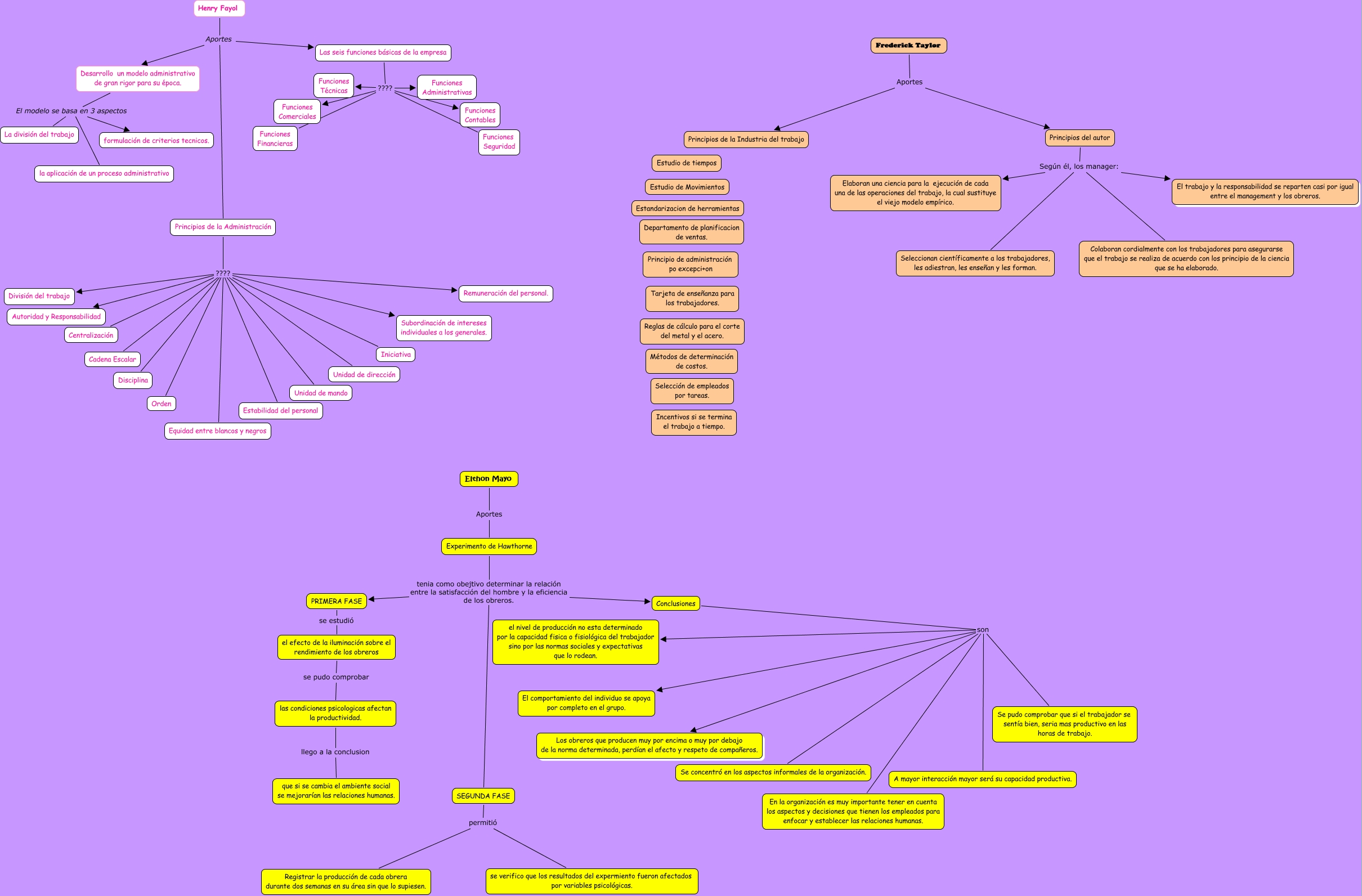 Este Cmap, tiene información relacionada con: Fayol,taylor,mayo, Principios de la Administración ???? Unidad de mando, Las seis funciones básicas de la empresa ???? Funciones Seguridad, Principios del autor Según él, los manager: Seleccionan científicamente a los trabajadores, les adiestran, les enseñan y les forman., Desarrollo un modelo administrativo de gran rigor para su época. El modelo se basa en 3 aspectos La división del trabajo, el efecto de la iluminación sobre el rendimiento de los obreros se pudo comprobar las condiciones psicologicas afectan la productividad., Principios de la Administración ???? Remuneración del personal., Frederick Taylor Aportes Principios de la Industria del trabajo, Henry Fayol Aportes Desarrollo un modelo administrativo de gran rigor para su época., Principios de la Administración ???? Unidad de dirección, Principios de la Administración ???? Estabilidad del personal, Principios de la Administración ???? Centralización, Conclusiones son el nivel de producción no esta determinado por la capacidad fisica o fisiológica del trabajador sino por las normas sociales y expectativas que lo rodean., Principios del autor Según él, los manager: Elaboran una ciencia para la ejecución de cada una de las operaciones del trabajo, la cual sustituye el viejo modelo empírico., Conclusiones son Los obreros que producen muy por encima o muy por debajo de la norma determinada, perdían el afecto y respeto de compañeros., Experimento de Hawthorne tenia como obejtivo determinar la relación entre la satisfacción del hombre y la eficiencia de los obreros. Conclusiones, Principios del autor Según él, los manager: El trabajo y la responsabilidad se reparten casi por igual entre el management y los obreros., SEGUNDA FASE permitió se verifico que los resultados del expermiento fueron afectados por variables psicológicas., Henry Fayol Aportes Las seis funciones básicas de la empresa, Las seis funciones básicas de la empresa ???? Funciones Comerciales, Desarrollo un modelo administrativo de gran rigor para su época. El modelo se basa en 3 aspectos la aplicación de un proceso administrativo