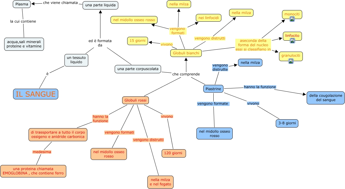 Questa Cmap, creata con IHMC CmapTools, contiene informazioni relative a: Il Sangue, un tessuto liquido ed è formata da una parte corpuscolata, un tessuto liquido ed è formata da una parte liquida, Globuli rossi vengono distrutti nella milza e nel fegato, Globuli bianchi vengono formati nel midollo osseo rosso, una parte liquida che viene chiamata Plasma, Globuli bianchi aseconda della forma del nucleo essi si classifiano in granulociti, una parte corpuscolata che comprende Globuli rossi, Piastrine hanno la funzione della cougolazione del sangue, Piastrine vengono formate nel midollo osseo rosso, Globuli bianchi aseconda della forma del nucleo essi si classifiano in linfocito, Plasma la cui contiene acqua,sali minerali proteine e vitamine, una parte corpuscolata che comprende Globuli bianchi, Globuli bianchi vivono 15 giorni, un tessuto liquido è IL SANGUE, una parte corpuscolata che comprende Piastrine, Globuli bianchi vengono formati nei linfocidi, Piastrine vengono distrutte nella milza, Globuli bianchi vengono distrutti nella milza, Piastrine vivono 3-8 giorni, Globuli bianchi vengono formati nella milza