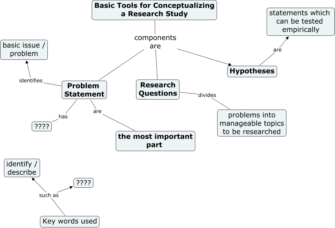 This Concept Map, created with IHMC CmapTools, has information related to: Problem statement & Research Questions, Key words used such as identify / describe, Problem Statement are the most important part, Hypotheses are statements which can be tested empirically, Basic Tools for Conceptualizing a Research Study components are Problem Statement, Key words used such as ????, Research Questions divides problems into manageable topics to be researched, Basic Tools for Conceptualizing a Research Study components are Research Questions, Basic Tools for Conceptualizing a Research Study components are Hypotheses, Problem Statement has ????, Problem Statement identifies basic issue / problem