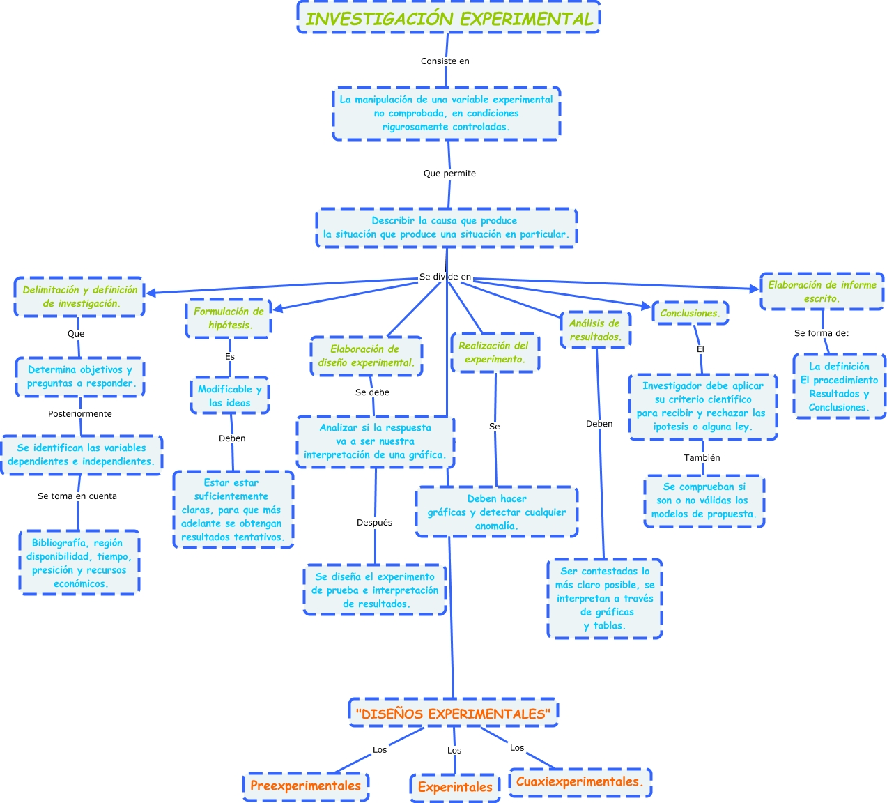 Este Cmap, tiene información relacionada con: INVESTIGACIÓN EXPERIMETAL, Conclusiones. El Investigador debe aplicar su criterio científico para recibir y rechazar las ipotesis o alguna ley., "DISEÑOS EXPERIMENTALES" Los Preexperimentales, Describir la causa que produce la situación que produce una situación en particular. Se divide en Realización del experimento., Describir la causa que produce la situación que produce una situación en particular. Se divide en Conclusiones., Describir la causa que produce la situación que produce una situación en particular. Se divide en Elaboración de informe escrito., Realización del experimento. Se Deben hacer gráficas y detectar cualquier anomalía., Describir la causa que produce la situación que produce una situación en particular. Se divide en Elaboración de diseño experimental., INVESTIGACIÓN EXPERIMENTAL Consiste en La manipulación de una variable experimental no comprobada, en condiciones rigurosamente controladas., Modificable y las ideas Deben Estar estar suficientemente claras, para que más adelante se obtengan resultados tentativos., Elaboración de informe escrito. Se forma de: La definición El procedimiento Resultados y Conclusiones., Elaboración de diseño experimental. Se debe Analizar si la respuesta va a ser nuestra interpretación de una gráfica., Se identifican las variables dependientes e independientes. Se toma en cuenta Bibliografía, región disponibilidad, tiempo, presición y recursos económicos., Analizar si la respuesta va a ser nuestra interpretación de una gráfica. Después Se diseña el experimento de prueba e interpretación de resultados., Análisis de resultados. Deben Ser contestadas lo más claro posible, se interpretan a través de gráficas y tablas., Delimitación y definición de investigación. Que Determina objetivos y preguntas a responder., "DISEÑOS EXPERIMENTALES" Los Experintales, Determina objetivos y preguntas a responder. Posteriormente Se identifican las variables dependientes e independientes., Describir la causa que produce la situación que produce una situación en particular. Se divide en Formulación de hipótesis., Describir la causa que produce la situación que produce una situación en particular. Se divide en Análisis de resultados., Describir la causa que produce la situación que produce una situación en particular. ???? "DISEÑOS EXPERIMENTALES"