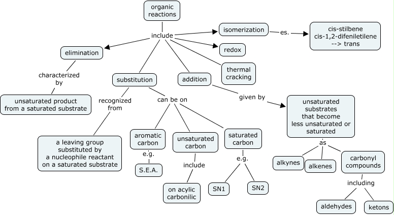 Questa Cmap, creata con IHMC CmapTools, contiene informazioni relative a: Organic_Reactions, unsaturated substrates that become less unsaturated or saturated as alkynes, unsaturated substrates that become less unsaturated or saturated as alkenes, organic reactions include thermal cracking, substitution can be on aromatic carbon, saturated carbon e.g. SN1, carbonyl compounds including ketons, addition given by unsaturated substrates that become less unsaturated or saturated, substitution can be on unsaturated carbon, unsaturated substrates that become less unsaturated or saturated as carbonyl compounds, organic reactions include addition, organic reactions include isomerization, organic reactions include substitution, saturated carbon e.g. SN2, carbonyl compounds including aldehydes, substitution recognized from a leaving group substituted by a nucleophile reactant on a saturated substrate, unsaturated carbon include on acylic carbonilic, organic reactions include elimination, substitution can be on saturated carbon, aromatic carbon e.g. S.E.A., organic reactions include redox
