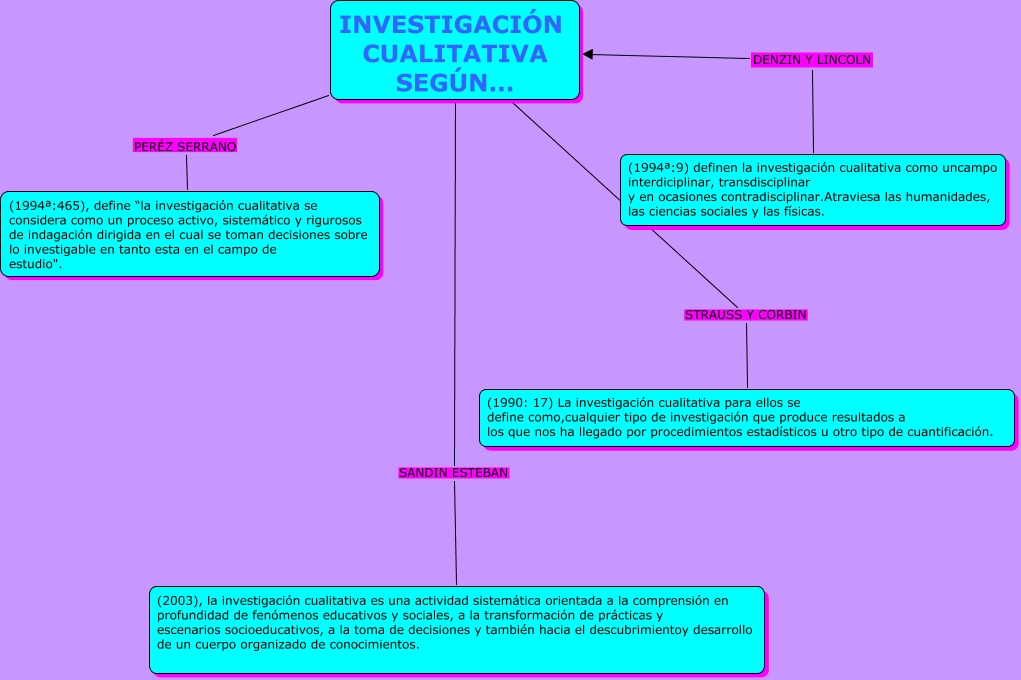 Este Cmap, tiene información relacionada con: INVESTIGACION CUALITATIVA (SEGUN AUTORES), INVESTIGACIÓN CUALITATIVA SEGÚN... SANDIN ESTEBAN (2003), la investigación cualitativa es una actividad sistemática orientada a la comprensión en profundidad de fenómenos educativos y sociales, a la transformación de prácticas y escenarios socioeducativos, a la toma de decisiones y también hacia el descubrimientoy desarrollo de un cuerpo organizado de conocimientos., (1994ª:9) definen la investigación cualitativa como uncampo interdiciplinar, transdisciplinar y en ocasiones contradisciplinar.Atraviesa las humanidades, las ciencias sociales y las físicas. DENZIN Y LINCOLN INVESTIGACIÓN CUALITATIVA SEGÚN..., INVESTIGACIÓN CUALITATIVA SEGÚN... PERÉZ SERRANO (1994ª:465), define “la investigación cualitativa se considera como un proceso activo, sistemático y rigurosos de indagación dirigida en el cual se toman decisiones sobre lo investigable en tanto esta en el campo de estudio"., INVESTIGACIÓN CUALITATIVA SEGÚN... STRAUSS Y CORBIN (1990: 17) La investigación cualitativa para ellos se define como,cualquier tipo de investigación que produce resultados a los que nos ha llegado por procedimientos estadísticos u otro tipo de cuantificación.