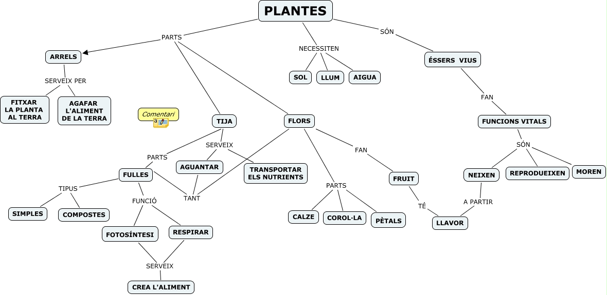 Aquest mapa conceptual conté informació relacionada amb: PLANTES, FULLES FUNCIÓ FOTOSÍNTESI, FUNCIONS VITALS SÓN NEIXEN, FULLES TIPUS COMPOSTES, PLANTES PARTS ARRELS, PÈTALS PARTS COROL·LA, AGUANTAR TANT FULLES, PLANTES PARTS TIJA, FRUIT TÉ LLAVOR, ARRELS SERVEIX PER FITXAR LA PLANTA AL TERRA, ARRELS SERVEIX PER AGAFAR L'ALIMENT DE LA TERRA, PÈTALS PARTS CALZE, TIJA SERVEIX TRANSPORTAR ELS NUTRIENTS, PLANTES SÓN ÉSSERS VIUS, TIJA PARTS FULLES, FULLES FUNCIÓ RESPIRAR, PLANTES NECESSITEN AIGUA, RESPIRAR SERVEIX FOTOSÍNTESI, RESPIRAR SERVEIX CREA L'ALIMENT, FLORS FAN FRUIT, PLANTES NECESSITEN LLUM