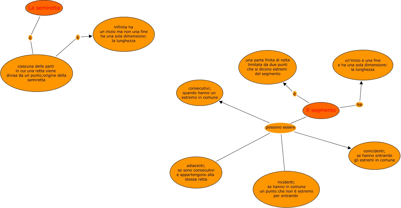 Questa Cmap, creata con IHMC CmapTools, contiene informazioni relative a: la semiretta e il segmento, Il segmento è una parte finita di retta limitata da due punti che si dicono estremi del segmento, ciascuna delle parti in cui una retta viene divisa da un punto;origine della semiretta è infinita ha un inizio ma non una fine ha una sola dimensione: la lunghezza, Il segmento possono essere incidenti; se hanno in comune un punto che non è estremo per entrambi, Il segmento possono essere coincidenti; se hanno entrambi gli estremi in comune, Il segmento possono essere consecutivi; quando hanno un estremo in comune, Il segmento ha un'inizio e una fine e ha una sola dimensione: la lunghezza, Il segmento possono essere adiacenti; se sono consecutivi e appartengono alla stessa retta, La semiretta è ciascuna delle parti in cui una retta viene divisa da un punto;origine della semiretta
