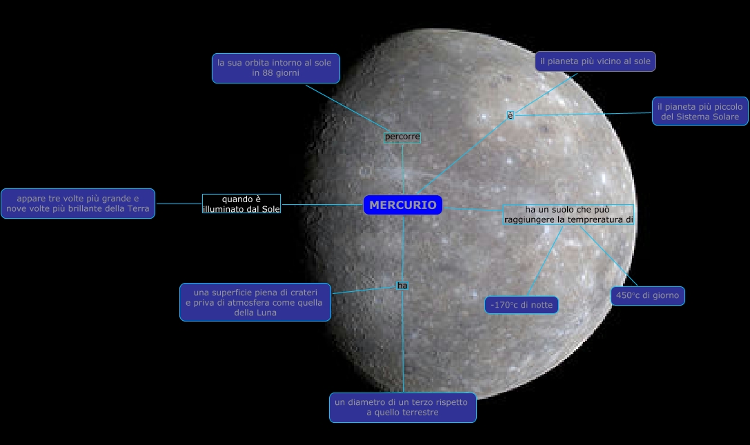 Questa Cmap, creata con IHMC CmapTools, contiene informazioni relative a: mercurio, MERCURIO è il pianeta più piccolo del Sistema Solare, MERCURIO quando è illuminato dal Sole appare tre volte più grande e nove volte più brillante della Terra, MERCURIO ha una superficie piena di crateri e priva di atmosfera come quella della Luna, MERCURIO ha un suolo che può raggiungere la tempreratura di -170°c di notte, MERCURIO è il pianeta più vicino al sole, MERCURIO ha un suolo che può raggiungere la tempreratura di 450°c di giorno, MERCURIO ha un diametro di un terzo rispetto a quello terrestre, MERCURIO percorre la sua orbita intorno al sole in 88 giorni
