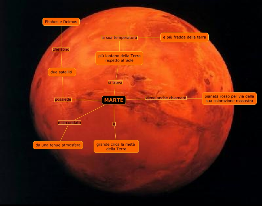 Questa Cmap, creata con IHMC CmapTools, contiene informazioni relative a: marte, MARTE è circondato da una tenue atmosfera, MARTE possiede due satelliti, MARTE si trova più lontano della Terra rispetto al Sole, due satelliti che sono Phobos e Deimos, più lontano della Terra rispetto al Sole la sua temperatura è più fredda della terra, MARTE è grande circa la metà della Terra, MARTE viene anche chiamato pianeta rosso per via della sua colorazione rossastra