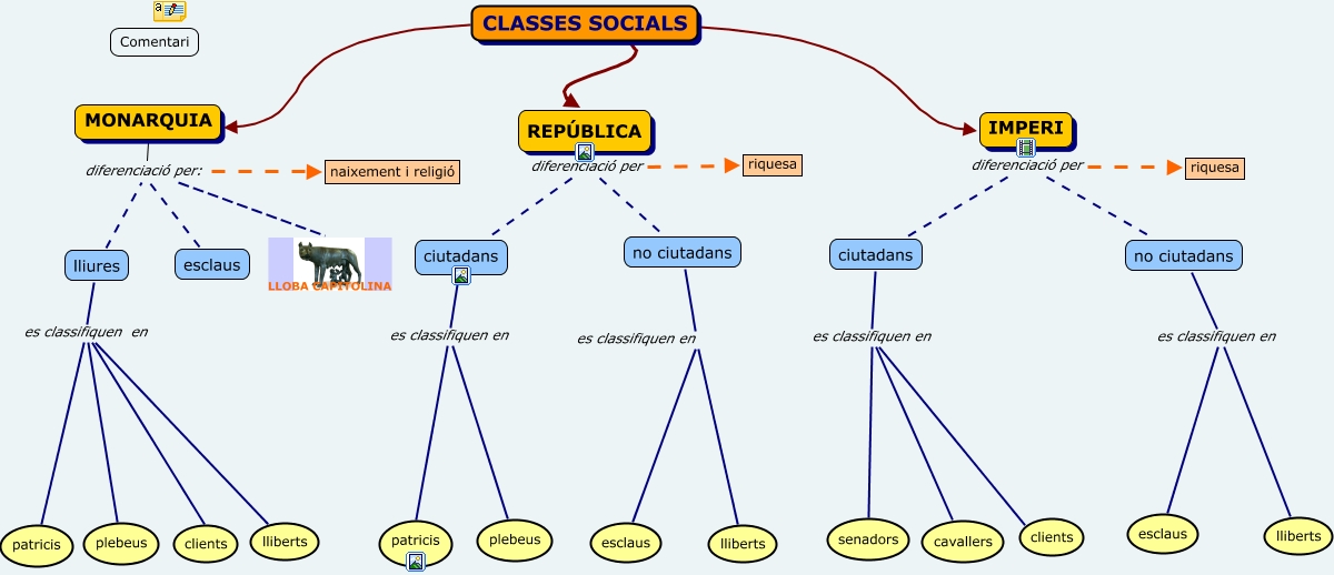 Este Cmap, tiene información relacionada con: activitat2, no ciutadans es classifiquen en lliberts, no ciutadans es classifiquen en lliberts, lliures es classifiquen en plebeus, ciutadans es classifiquen en senadors, lliures diferenciació per: LLOBA CAPITOLINA, REPÚBLICA diferenciació per riquesa, lliures es classifiquen en lliberts, lliures es classifiquen en patricis, no ciutadans es classifiquen en esclaus, IMPERI diferenciació per ciutadans, CLASSES SOCIALS MONARQUIA, CLASSES SOCIALS REPÚBLICA, ciutadans es classifiquen en clients, esclaus diferenciació per: LLOBA CAPITOLINA, no ciutadans es classifiquen en esclaus, REPÚBLICA diferenciació per no ciutadans, ciutadans es classifiquen en cavallers, MONARQUIA diferenciació per: naixement i religió, esclaus diferenciació per: naixement i religió, lliures diferenciació per: naixement i religió