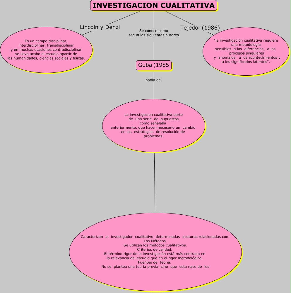 Este Cmap, tiene información relacionada con: investigacion cualitativa, Guba (1985 ???? Caracterizan al investigador cualitativo determinadas posturas relacionadas con: Los Métodos. Se utilizan los métodos cualitativos. Criterios de calidad. El término rigor de la investigación está más centrado en la relevancia del estudio que en el rigor metodológico. Fuentes de teoría. No se plantea una teoría previa, sino que esta nace de los, Guba (1985 habla de La investigacion cualitativa parte de una serie de supuestos, como señalaba anteriormente, que hacen necesario un cambio en las estrategias de resolución de problemas., INVESTIGACION CUALITATIVA Tejedor (1986) "la investigación cualitativa requiere una metodología sensibles a las diferencias, a los procesos singulares y anómalos, a los acontecimientos y a los significados latentes"., INVESTIGACION CUALITATIVA Se conoce como segun los siguientes autores Guba (1985, INVESTIGACION CUALITATIVA Lincoln y Denzi Es un campo disciplinar, interdisciplinar, transdisciplinar y en muchas ocasiones contradisciplinar se lleva acabo el estudio apartir de las humanidades, ciencias sociales y fisicas.