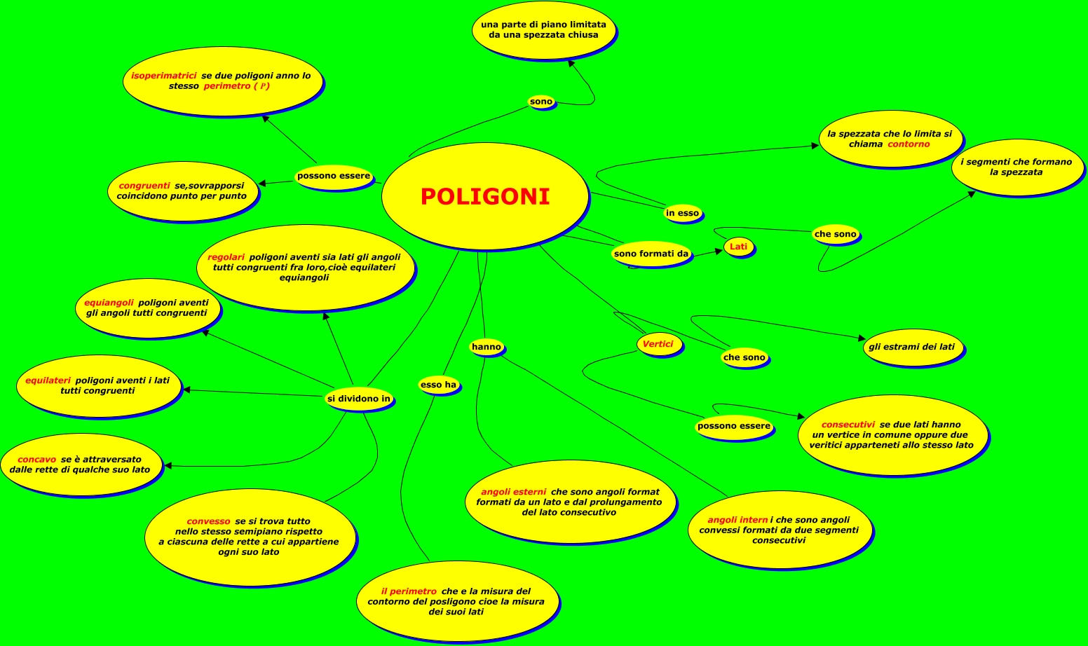 Questa Cmap, creata con IHMC CmapTools, contiene informazioni relative a: poligoni, POLIGONI esso ha il perimetro che e la misura del contorno del posligono cioe la misura dei suoi lati, POLIGONI hanno angoli interni che sono angoli convessi formati da due segmenti consecutivi, POLIGONI sono formati da Lati, POLIGONI possono essere congruenti se,sovrapporsi coincidono punto per punto, POLIGONI hanno angoli esterni che sono angoli format formati da un lato e dal prolungamento del lato consecutivo, POLIGONI si dividono in equiangoli poligoni aventi gli angoli tutti congruenti, POLIGONI sono una parte di piano limitata da una spezzata chiusa, POLIGONI si dividono in regolari poligoni aventi sia lati gli angoli tutti congruenti fra loro,cioè equilateri equiangoli, Vertici possono essere consecutivi se due lati hanno un vertice in comune oppure due veritici apparteneti allo stesso lato, Vertici che sono gli estrami dei lati, POLIGONI si dividono in concavo se è attraversato dalle rette di qualche suo lato, POLIGONI si dividono in convesso se si trova tutto nello stesso semipiano rispetto a ciascuna delle rette a cui appartiene ogni suo lato, POLIGONI si dividono in equilateri poligoni aventi i lati tutti congruenti, POLIGONI in esso la spezzata che lo limita si chiama contorno, Lati che sono i segmenti che formano la spezzata, POLIGONI sono formati da Vertici, POLIGONI possono essere isoperimatrici se due poligoni anno lo stesso perimetro (Ρ)