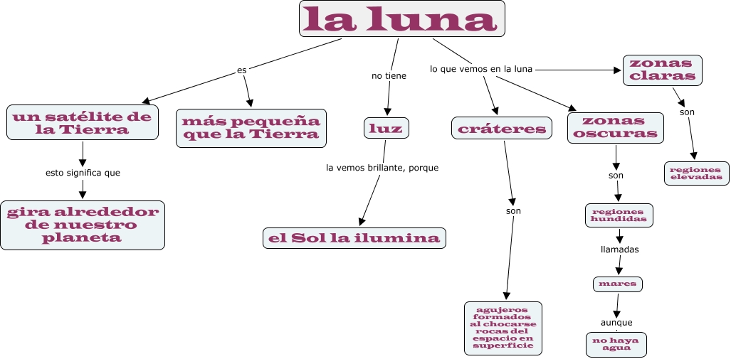 Este Cmap, tiene información relacionada con: la luna, la luna no tiene luz, zonas oscuras son regiones hundidas, zonas claras son regiones elevadas, cráteres son agujeros formados al chocarse rocas del espacio en superficie, mares aunque no haya agua, un satélite de la Tierra esto significa que gira alrededor de nuestro planeta, luz la vemos brillante, porque el Sol la ilumina, la luna es un satélite de la Tierra, la luna lo que vemos en la luna zonas claras, regiones hundidas llamadas mares, la luna lo que vemos en la luna cráteres, la luna es más pequeña que la Tierra, la luna lo que vemos en la luna zonas oscuras