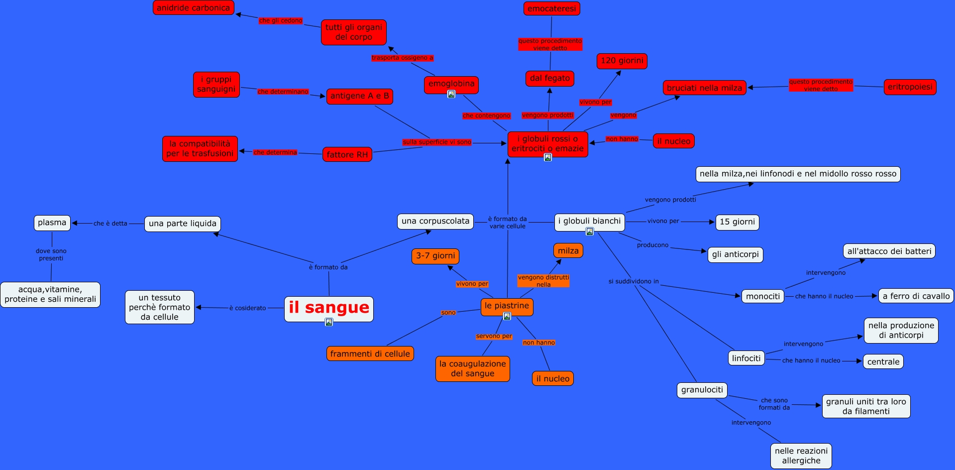 Questa Cmap, creata con IHMC CmapTools, contiene informazioni relative a: il sangue, monociti che hanno il nucleo a ferro di cavallo, i globuli bianchi vengono prodotti nella milza,nei linfonodi e nel midollo rosso rosso, i gruppi sanguigni che determinano antigene A e B, emoglobina che contengono i globuli rossi o eritrociti o emazie, tutti gli organi del corpo che gli cedono anidride carbonica, le piastrine è formato da varie cellule i globuli rossi o eritrociti o emazie, emoglobina trasporta ossigeno a tutti gli organi del corpo, i globuli bianchi producono gli anticorpi, granulociti si suddividono in linfociti, il nucleo non hanno i globuli rossi o eritrociti o emazie, le piastrine non hanno il nucleo, antigene A e B sulla superficie vi sono i globuli rossi o eritrociti o emazie, una corpuscolata è formato da varie cellule i globuli rossi o eritrociti o emazie, granulociti si suddividono in monociti, i globuli bianchi si suddividono in monociti, linfociti intervengono nella produzione di anticorpi, i globuli bianchi si suddividono in linfociti, le piastrine vivono per 3-7 giorni, emocateresi questo procedimento viene detto dal fegato, fattore RH sulla superficie vi sono i globuli rossi o eritrociti o emazie