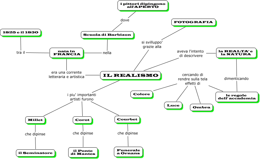 Questa Cmap, creata con IHMC CmapTools, contiene informazioni relative a: IL REALISMO (Arte), Corot che dipinse il Ponte di Mantes, IL REALISMO i piu' importanti artisti furono Courbet, IL REALISMO si svilluppo' grazie alla FOTOGRAFIA, la REALTA' e la NATURA dimenticando le regole dell' accademia, IL REALISMO i piu' importanti artisti furono Corot, nata in FRANCIA nella Scuola di Barbizon, IL REALISMO i piu' importanti artisti furono Millet, IL REALISMO aveva l'intento di descrivere la REALTA' e la NATURA, Courbet che dipinse Funerale a Ornans, le regole dell' accademia cercando di rendre sulla tela effetti di Luce, Millet che dipinse il Seminatore, IL REALISMO era una corrente letteraria e artistica nata in FRANCIA, Scuola di Barbizon dove i pittori dipingono all'APERTO, le regole dell' accademia cercando di rendre sulla tela effetti di Colore, nata in FRANCIA tra il 1825 e il 1830, le regole dell' accademia cercando di rendre sulla tela effetti di Ombra