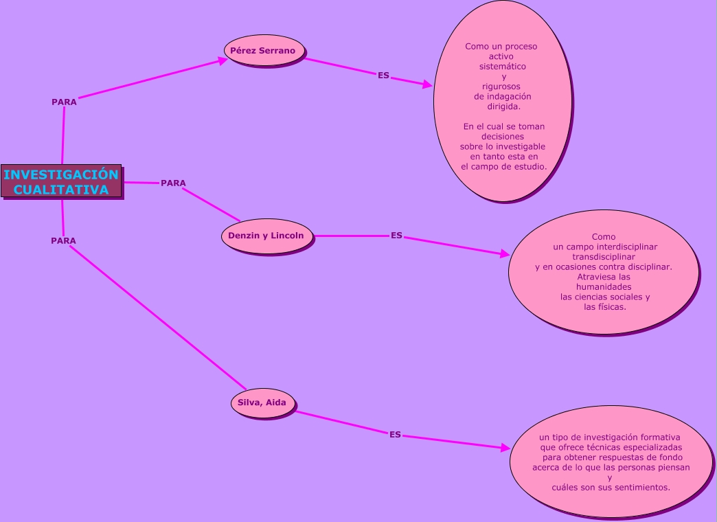 Este Cmap, tiene información relacionada con: INVESTIGACIÓN CUALITATIVA, INVESTIGACIÓN CUALITATIVA PARA Denzin y Lincoln, Pérez Serrano ES Como un proceso activo sistemático y rigurosos de indagación dirigida. En el cual se toman decisiones sobre lo investigable en tanto esta en el campo de estudio., INVESTIGACIÓN CUALITATIVA PARA Silva, Aida, Silva, Aida ES un tipo de investigación formativa que ofrece técnicas especializadas para obtener respuestas de fondo acerca de lo que las personas piensan y cuáles son sus sentimientos., INVESTIGACIÓN CUALITATIVA PARA Pérez Serrano, Denzin y Lincoln ES Como un campo interdisciplinar transdisciplinar y en ocasiones contra disciplinar. Atraviesa las humanidades las ciencias sociales y las físicas.