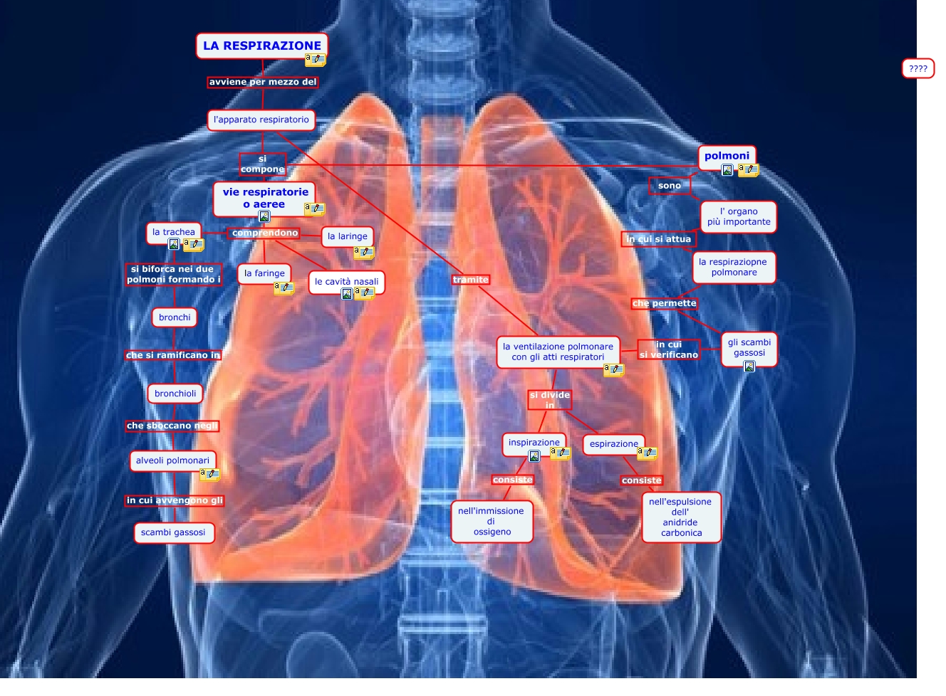 Questa Cmap, creata con IHMC CmapTools, contiene informazioni relative a: apparato respiratorio, bronchioli che sboccano negli alveoli polmonari, l'apparato respiratorio tramite la ventilazione polmonare con gli atti respiratori, la respiraziopne polmonare che permette gli scambi gassosi, l'apparato respiratorio si compone polmoni, la trachea si biforca nei due polmoni formando i bronchi, espirazione consiste nell'espulsione dell' anidride carbonica, gli scambi gassosi in cui si verificano la ventilazione polmonare con gli atti respiratori, la faringe comprendono la laringe, bronchi che si ramificano in bronchioli, la faringe comprendono le cavità nasali, LA RESPIRAZIONE avviene per mezzo del l'apparato respiratorio, l'apparato respiratorio si compone vie respiratorie o aeree, la faringe comprendono vie respiratorie o aeree, polmoni sono l' organo più importante, alveoli polmonari in cui avvengono gli scambi gassosi, la ventilazione polmonare con gli atti respiratori si divide in espirazione, la ventilazione polmonare con gli atti respiratori si divide in inspirazione, l' organo più importante in cui si attua la respiraziopne polmonare, la faringe comprendono la trachea, inspirazione consiste nell'immissione di ossigeno