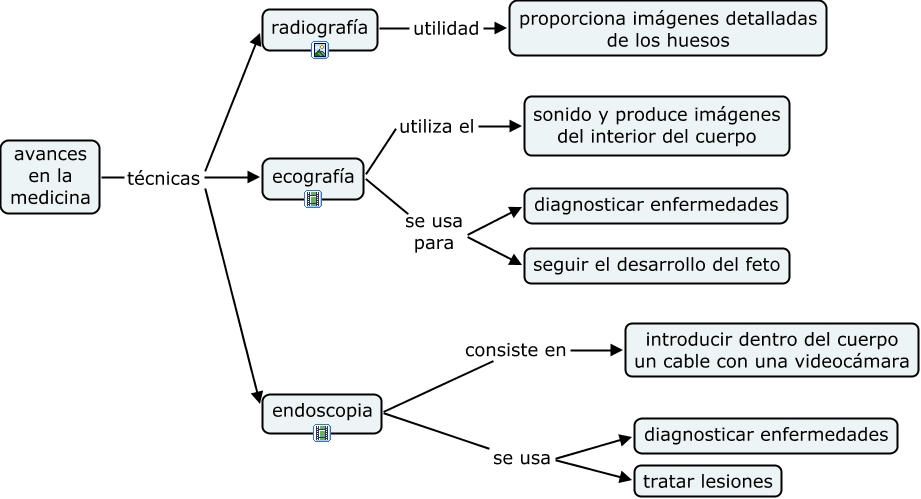 Este Cmap, tiene información relacionada con: avances técnicos en la medicina, radiografía utilidad proporciona imágenes detalladas de los huesos, ecografía se usa para seguir el desarrollo del feto, endoscopia consiste en introducir dentro del cuerpo un cable con una videocámara, avances en la medicina técnicas ecografía, avances en la medicina técnicas radiografía, ecografía se usa para diagnosticar enfermedades, ecografía utiliza el sonido y produce imágenes del interior del cuerpo, endoscopia se usa diagnosticar enfermedades, endoscopia se usa tratar lesiones, avances en la medicina técnicas endoscopia