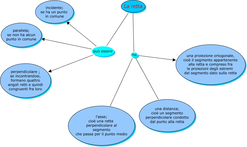 Questa Cmap, creata con IHMC CmapTools, contiene informazioni relative a: la retta, La retta ha una proiezione ortogonale, cioè il segmento appartenente alla retta e compreso fra le proiezioni degli estremi del segmento dato sulla retta, La retta può essere parallela; se non ha alcun punto in comune, La retta ha una distanza; cioè un segmento perpendicolare condotto dal punto alla retta, La retta può essere incidente; se ha un punto in comune, La retta può essere perpendicolare ; se incontrandosi, formano quattro angoli retti e quindi congruenti fra loro, La retta ha l'asse; cioè una retta perpendicolare al segmento che passa per il punto medio
