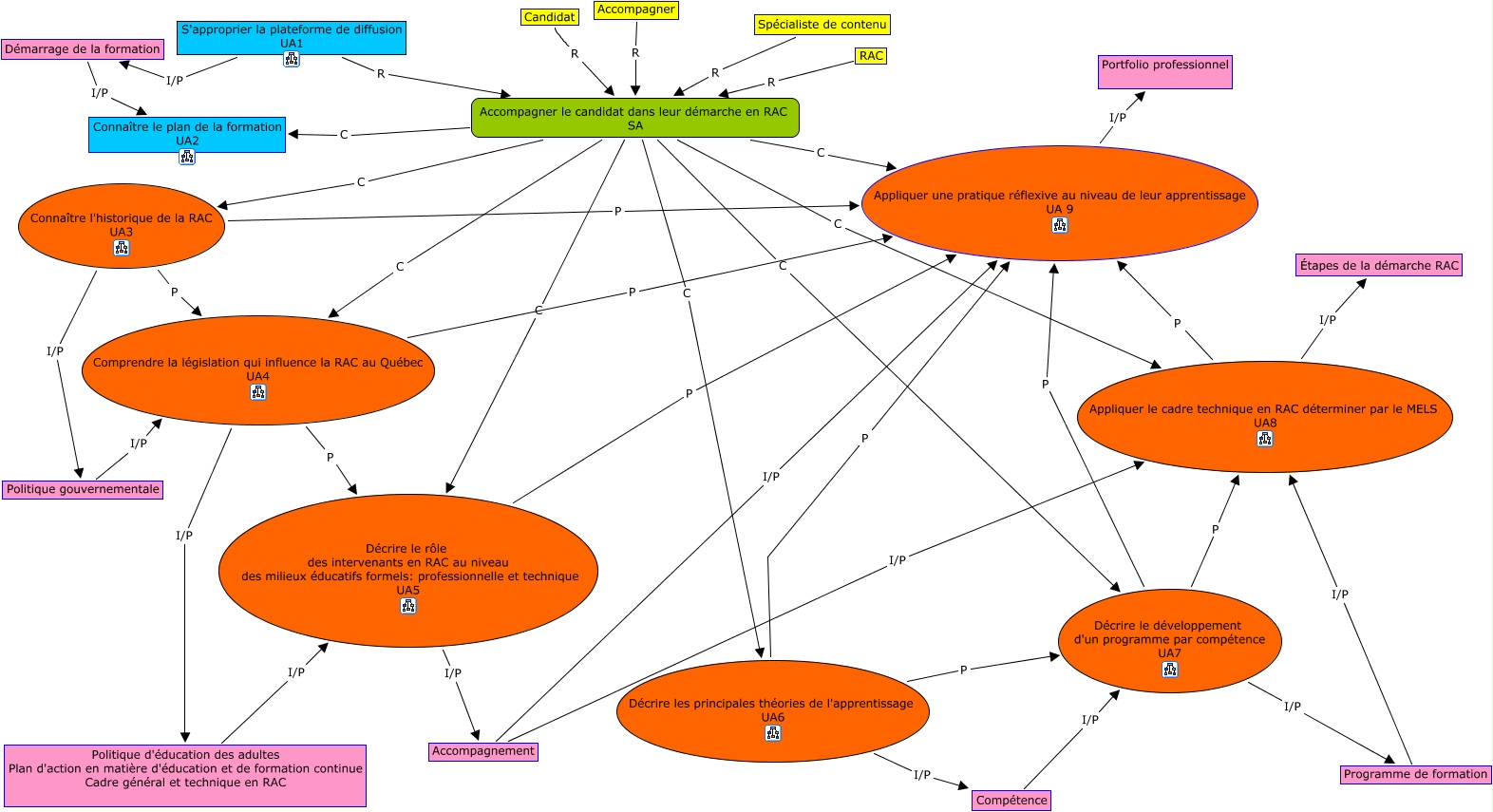 Cette carte de concepts créée avec IHMC CmapTools traite de: Structure d'apprentissage, Appliquer le cadre technique en RAC déterminer par le MELS UA8 P Appliquer une pratique réflexive au niveau de leur apprentissage UA 9, Décrire les principales théories de l'apprentissage UA6 P Appliquer une pratique réflexive au niveau de leur apprentissage UA 9, Accompagnement I/P Appliquer le cadre technique en RAC déterminer par le MELS UA8, Décrire les principales théories de l'apprentissage UA6 I/P Compétence, Compétence I/P Décrire le développement d'un programme par compétence UA7, Décrire le rôle des intervenants en RAC au niveau des milieux éducatifs formels: professionnelle et technique UA5 P Appliquer une pratique réflexive au niveau de leur apprentissage UA 9, Accompagner le candidat dans leur démarche en RAC SA C Décrire le rôle des intervenants en RAC au niveau des milieux éducatifs formels: professionnelle et technique UA5, Appliquer le cadre technique en RAC déterminer par le MELS UA8 I/P Étapes de la démarche RAC, Accompagner le candidat dans leur démarche en RAC SA C Connaître l'historique de la RAC UA3, Connaître l'historique de la RAC UA3 P Comprendre la législation qui influence la RAC au Québec UA4, S'approprier la plateforme de diffusion UA1 R Accompagner le candidat dans leur démarche en RAC SA, Décrire le développement d'un programme par compétence UA7 P Appliquer le cadre technique en RAC déterminer par le MELS UA8, Accompagner le candidat dans leur démarche en RAC SA C Décrire le développement d'un programme par compétence UA7, Accompagner le candidat dans leur démarche en RAC SA C Comprendre la législation qui influence la RAC au Québec UA4, Politique gouvernementale I/P Comprendre la législation qui influence la RAC au Québec UA4, Connaître l'historique de la RAC UA3 I/P Politique gouvernementale, Programme de formation I/P Appliquer le cadre technique en RAC déterminer par le MELS UA8, Décrire le développement d'un programme par compétence UA7 P Appliquer une pratique réflexive au niveau de leur apprentissage UA 9, Comprendre la législation qui influence la RAC au Québec UA4 I/P Politique d'éducation des adultes Plan d'action en matière d'éducation et de formation continue Cadre général et technique en RAC, S'approprier la plateforme de diffusion UA1 I/P Démarrage de la formation