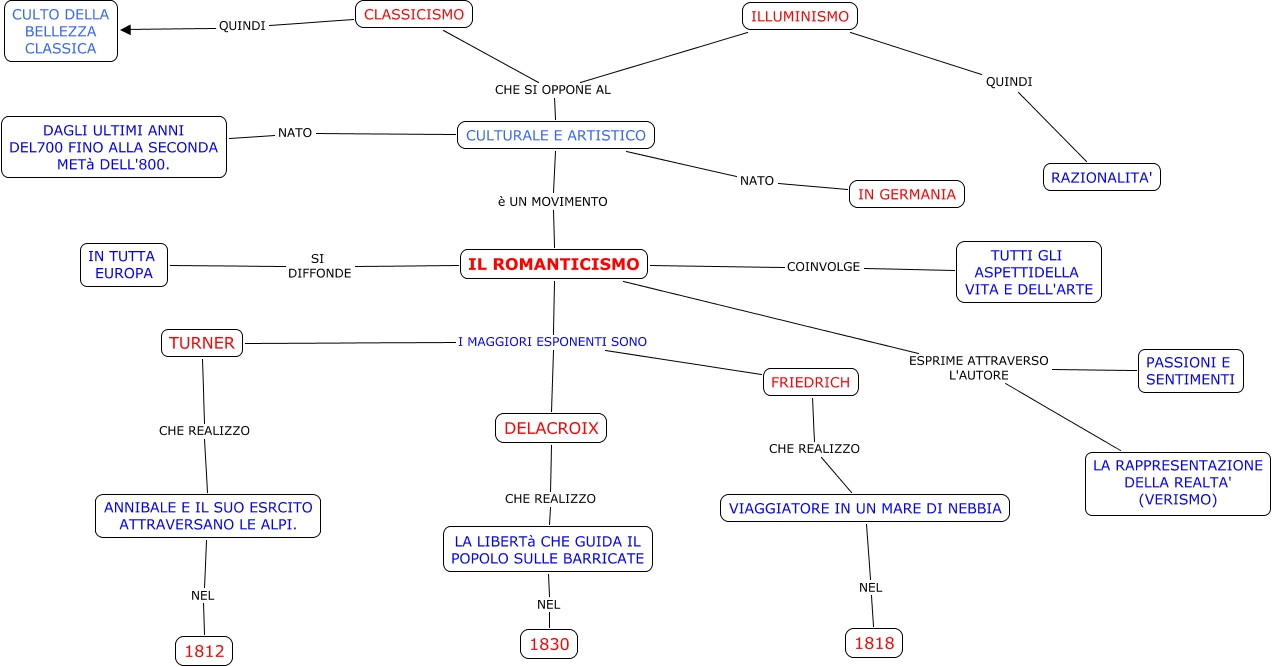 Questa Cmap, creata con IHMC CmapTools, contiene informazioni relative a: IL ROMANTICISMO, IL ROMANTICISMO I MAGGIORI ESPONENTI SONO TURNER, DELACROIX CHE REALIZZO LA LIBERTà CHE GUIDA IL POPOLO SULLE BARRICATE, VIAGGIATORE IN UN MARE DI NEBBIA NEL 1818, IL ROMANTICISMO ESPRIME ATTRAVERSO L'AUTORE PASSIONI E SENTIMENTI, CULTURALE E ARTISTICO CHE SI OPPONE AL ILLUMINISMO, ANNIBALE E IL SUO ESRCITO ATTRAVERSANO LE ALPI. NEL 1812, CULTURALE E ARTISTICO NATO IN GERMANIA, TURNER CHE REALIZZO ANNIBALE E IL SUO ESRCITO ATTRAVERSANO LE ALPI., IL ROMANTICISMO ESPRIME ATTRAVERSO L'AUTORE LA RAPPRESENTAZIONE DELLA REALTA' (VERISMO), CULTURALE E ARTISTICO CHE SI OPPONE AL CLASSICISMO, CLASSICISMO QUINDI CULTO DELLA BELLEZZA CLASSICA, IL ROMANTICISMO I MAGGIORI ESPONENTI SONO DELACROIX, FRIEDRICH CHE REALIZZO VIAGGIATORE IN UN MARE DI NEBBIA, IL ROMANTICISMO è UN MOVIMENTO CULTURALE E ARTISTICO, LA LIBERTà CHE GUIDA IL POPOLO SULLE BARRICATE NEL 1830, ILLUMINISMO QUINDI RAZIONALITA', IL ROMANTICISMO I MAGGIORI ESPONENTI SONO FRIEDRICH, CULTURALE E ARTISTICO NATO DAGLI ULTIMI ANNI DEL700 FINO ALLA SECONDA METà DELL'800., IL ROMANTICISMO SI DIFFONDE IN TUTTA EUROPA, IL ROMANTICISMO COINVOLGE TUTTI GLI ASPETTIDELLA VITA E DELL'ARTE