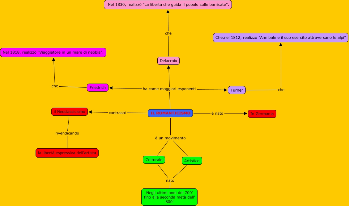 Questa Cmap, creata con IHMC CmapTools, contiene informazioni relative a: Il Romanticismo, IL ROMANTICISMO ha come maggiori esponenti Friedrich, IL ROMANTICISMO ha come maggiori esponenti Delacroix, Culturale nato Negli ultimi anni del 700' fino alla seconda metà dell' 800', IL ROMANTICISMO è un movimento Culturale, Delacroix che Nel 1830, realizzò "La libertà che guida il popolo sulle barricate"., Turner che Che,nel 1812, realizzò "Annibale e il suo esercito attraversano le alpi", IL ROMANTICISMO contrastò il Neoclassicismo, Friedrich che Nel 1818, realizzò "Viaggiatore in un mare di nebbia"., il Neoclassicismo rivendicando la libertà espressiva dell'artista, IL ROMANTICISMO è un movimento Artistico, IL ROMANTICISMO è nato In Germania, Artistico nato Negli ultimi anni del 700' fino alla seconda metà dell' 800', IL ROMANTICISMO ha come maggiori esponenti Turner