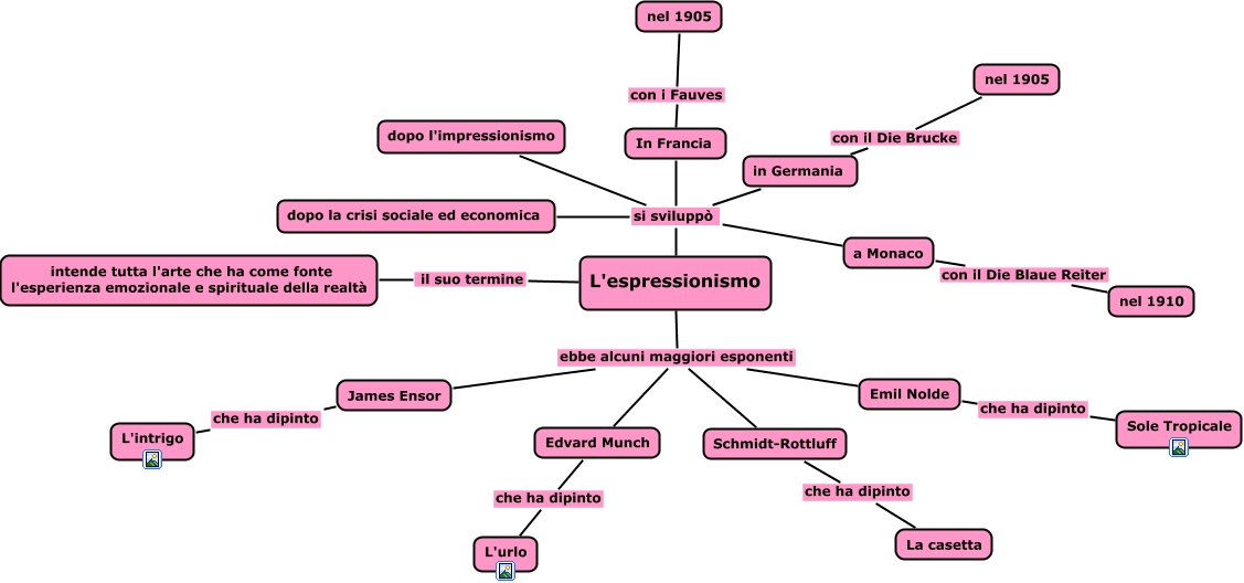 Questa Cmap, creata con IHMC CmapTools, contiene informazioni relative a: L'espressionismo, Schmidt-Rottluff che ha dipinto La casetta, L'espressionismo ebbe alcuni maggiori esponenti James Ensor, L'espressionismo si sviluppò dopo la crisi sociale ed economica, Edvard Munch che ha dipinto L'urlo, in Germania con il Die Brucke nel 1905, L'espressionismo si sviluppò in Germania, L'espressionismo il suo termine intende tutta l'arte che ha come fonte l'esperienza emozionale e spirituale della realtà, L'espressionismo si sviluppò dopo l'impressionismo, In Francia con i Fauves nel 1905, James Ensor che ha dipinto L'intrigo, L'espressionismo ebbe alcuni maggiori esponenti Schmidt-Rottluff, Emil Nolde che ha dipinto Sole Tropicale, L'espressionismo si sviluppò In Francia, L'espressionismo si sviluppò a Monaco, L'espressionismo ebbe alcuni maggiori esponenti Emil Nolde, a Monaco con il Die Blaue Reiter nel 1910, L'espressionismo ebbe alcuni maggiori esponenti Edvard Munch